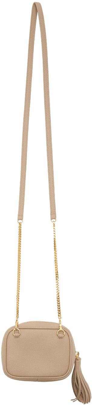 Quilted embossed calfskin shoulder bag in beige. Detachable curb chain shoulder strap with leather strap pad and lobster clasp fastening. Logo plaque at face. Leather tassel at zip closure. Leather logo patch at interior. Twill lining in black. Gold-tone hardware. Approx. 4 length x 3 height x 1.75 width. Supplier color: Dark beige Calfskin. Brand: Saint Laurent