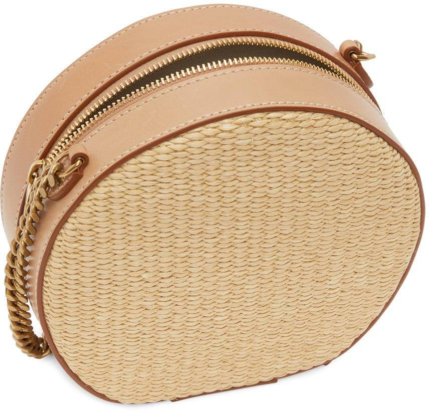 Woven raffia shoulder bag in beige. Buffed leather trim in beige with brown burnished edges throughout. Adjustable leather shoulder strap with curb chain detailing and post-stud fastening. Leather pull-tab with logo plaque at two-way zip closure. Expansion panels, card slot, and embossed leather logo patch at interior. Canvas lining in off-white. Logo-engraved antiqued gold-tone hardware. Approx. 7.5 length x 6.5 height x 3 width. Supplier color: Beige/Brown Raffia, leather. Brand: Saint Laurent