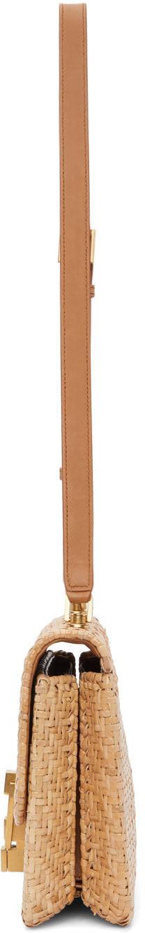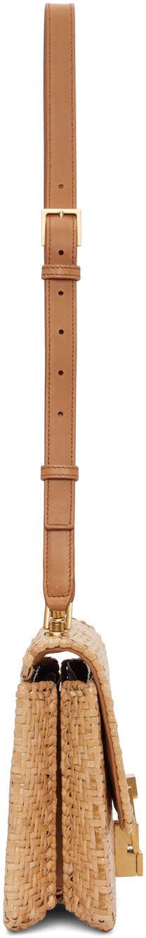 Woven wicker shoulder bag in beige. Adjustable buffed leather shoulder strap with pin-buckle fastening. Foldover flap with press-release fastening. Patch pocket and logo patch at interior. Buffed leather lining in brown. Antiqued gold-tone hardware. Approx. 9 length x 6.5 height x 2.5 width. Supplier color: Natural Textile, leather. Brand: Saint Laurent