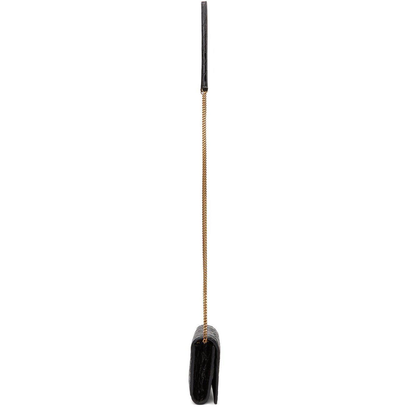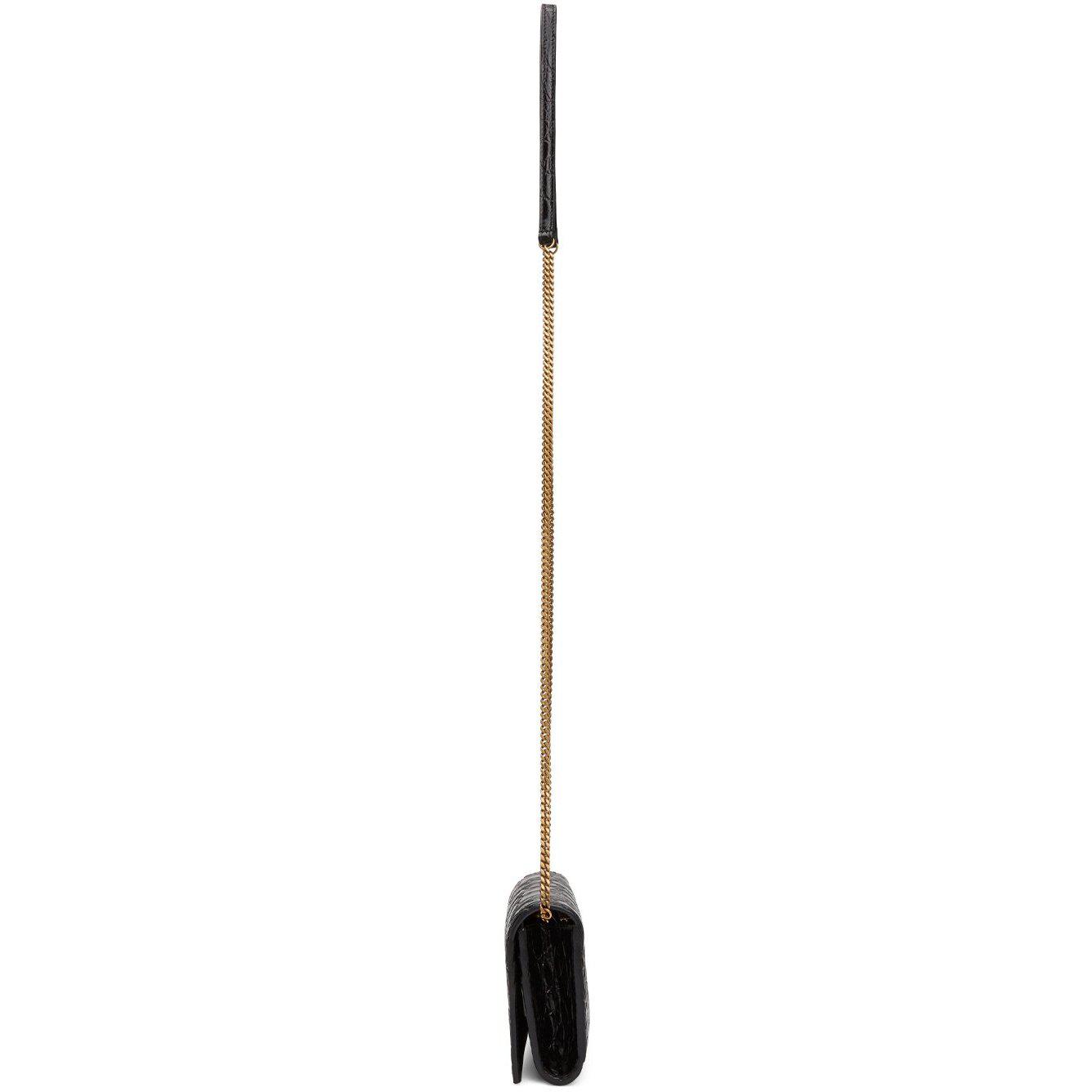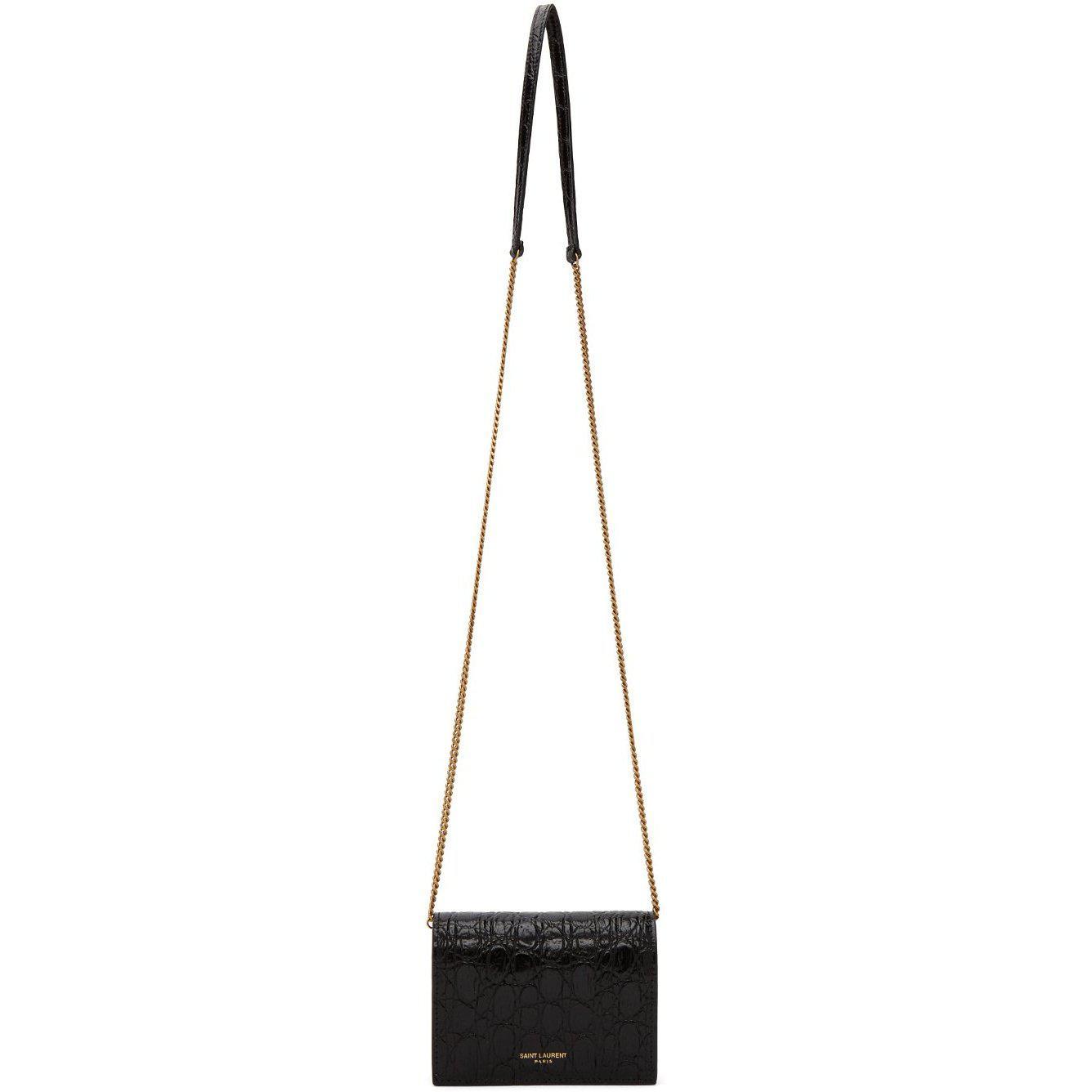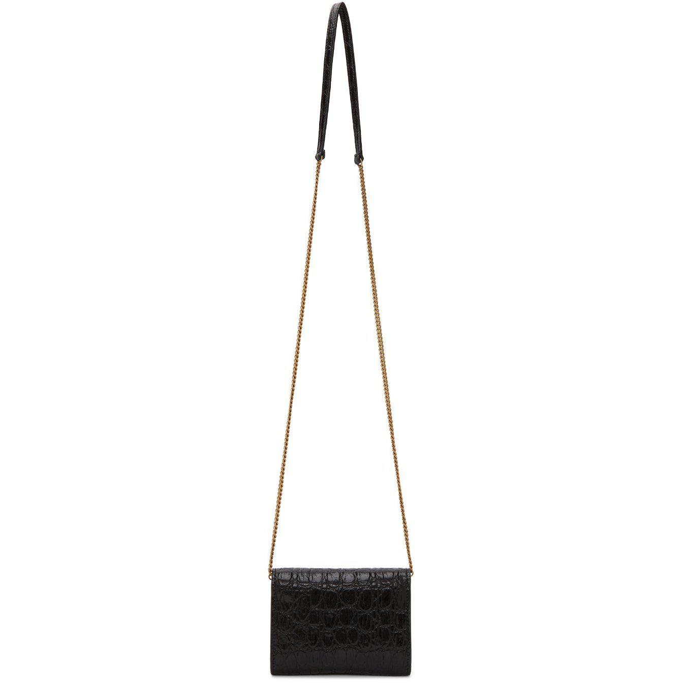Croc-embossed leather shoulder bag in black. Detachable curb chain shoulder strap with lobster clasp fastening and leather strap pad. Gold-tone logo stamp at face. Foldover flap with press-stud fastening. Five card slots, embossed logo, patch pocket, and zippered pocket at grained leather and textile interior. Antiqued gold-tone hardware. Approx. 4.75 length x 3.5 height x 1.25 width. Supplier color: Black Leather. Brand: Saint Laurent