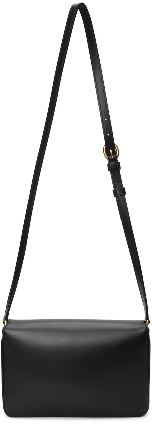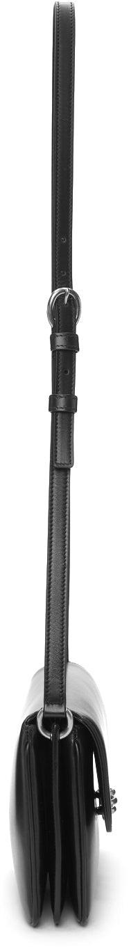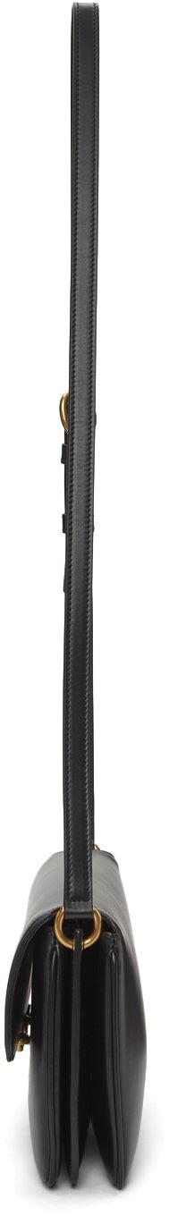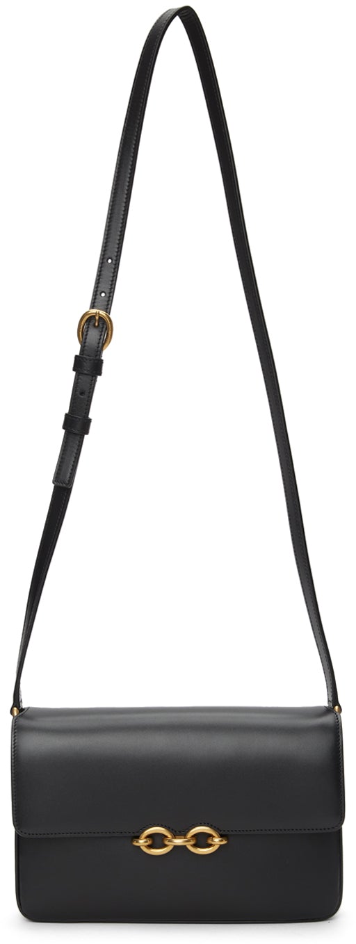 Buffed calfskin shoulder bag in black. Adjustable shoulder strap with pin-buckle fastening. Chain link hardware, gold-tone logo stamp, and concealed patch pocket at face. Foldover flap with magnetic closure. Gold-tone logo stamp, zippered pocket, and patch pocket at two-compartment interior. Tonal buffed leather lining. Antiqued gold-tone hardware. Approx. 10.5 length x 5 height x 2 width. Supplier color: Black Calfskin. Brand: Saint Laurent