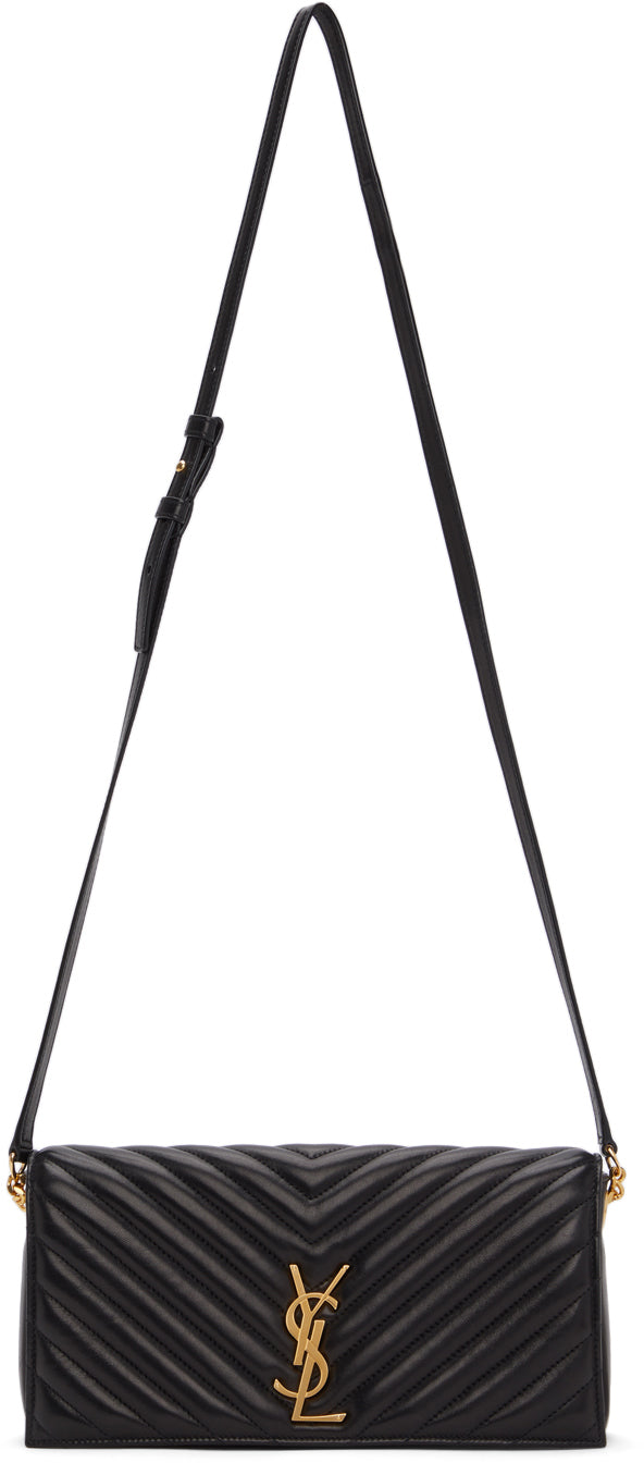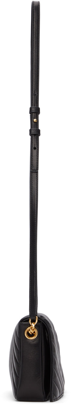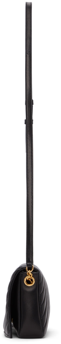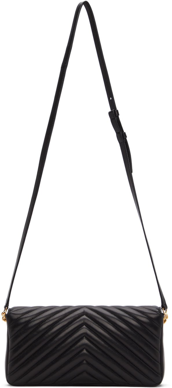 Quilted buffed lambskin shoulder bag in black. Detachable and adjustable leather shoulder strap with toggle fastening. Alternate detachable curb-chain shoulder strap with toggle fastening. Logo plaque at face. Foldover flap with magnetic press-stud fastening. Gold-tone logo stamp, leather logo patch, and zippered pocket at interior. Tonal textile lining. Antiqued gold-tone hardware. Approx. 10.25 length x 5.5 height x 2 width. Supplier color: Black Lambskin. Brand: Saint Laurent