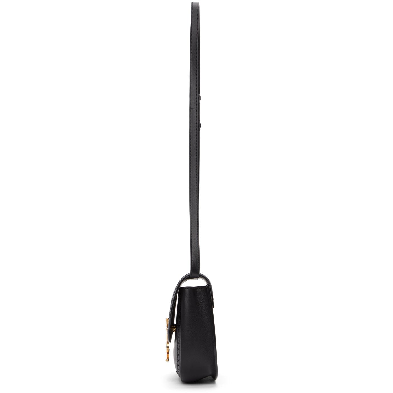 Buffed calfskin shoulder bag in black featuring perforated detailing throughout. Detachable and adjustable shoulder strap with post-stud fastening. Logo plaque and foldover flap with magnetic press-stud fastening at face. Patch pocket and gold-tone logo stamp at interior. Tonal suede lining. Antiqued gold-tone hardware. Approx. 8.5 length x 7 height x 2.75 width. Supplier color: Black Calfskin. Brand: Saint Laurent
