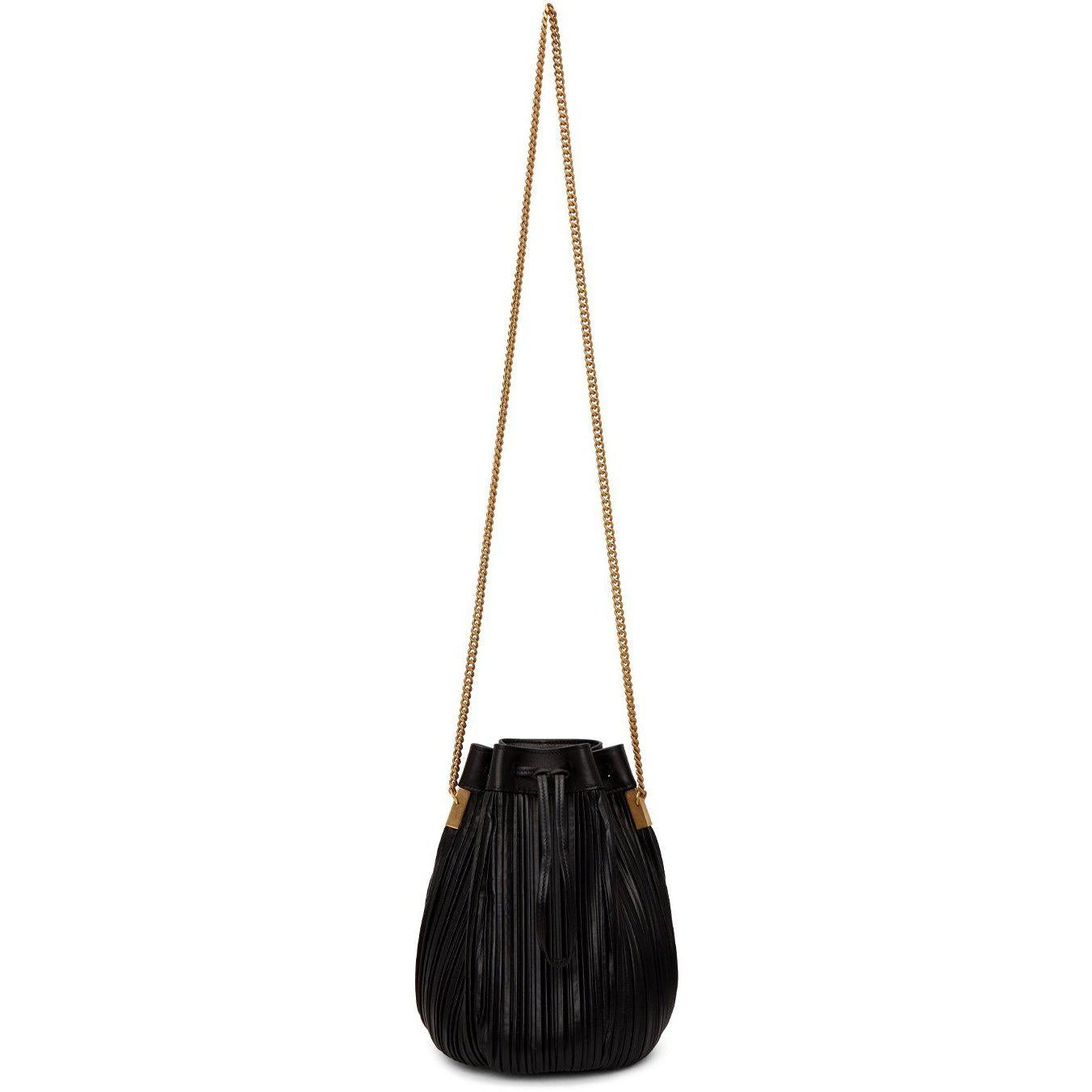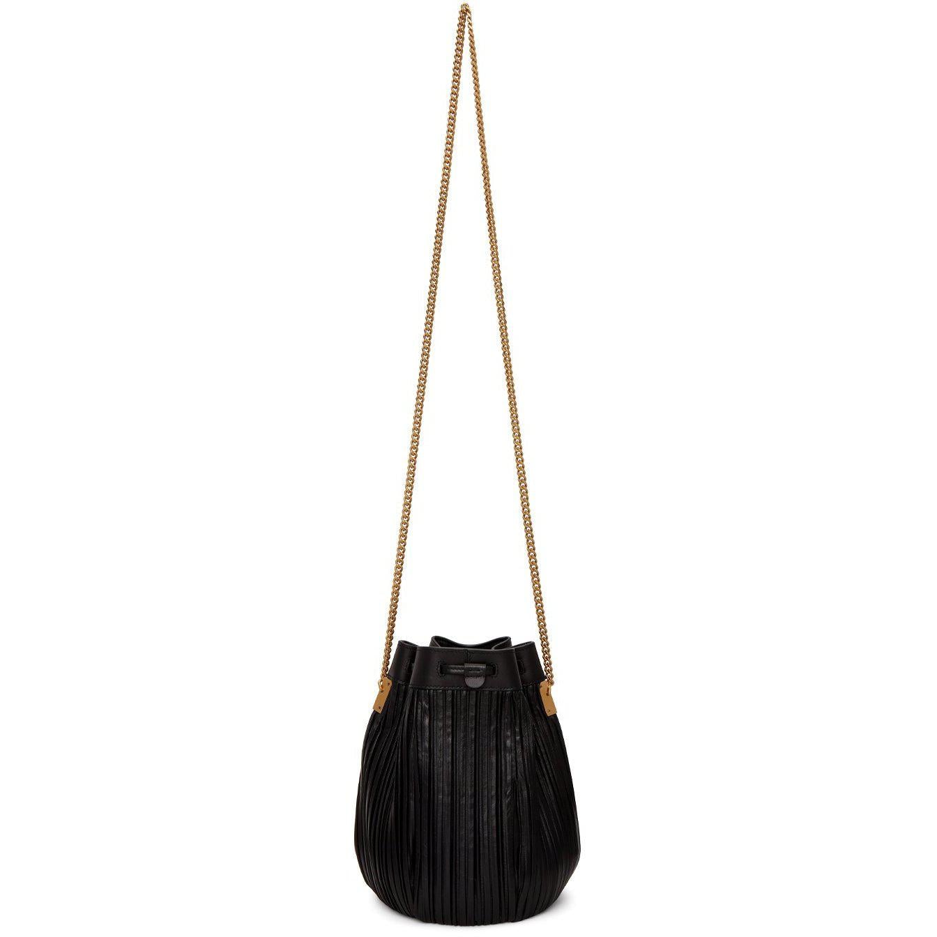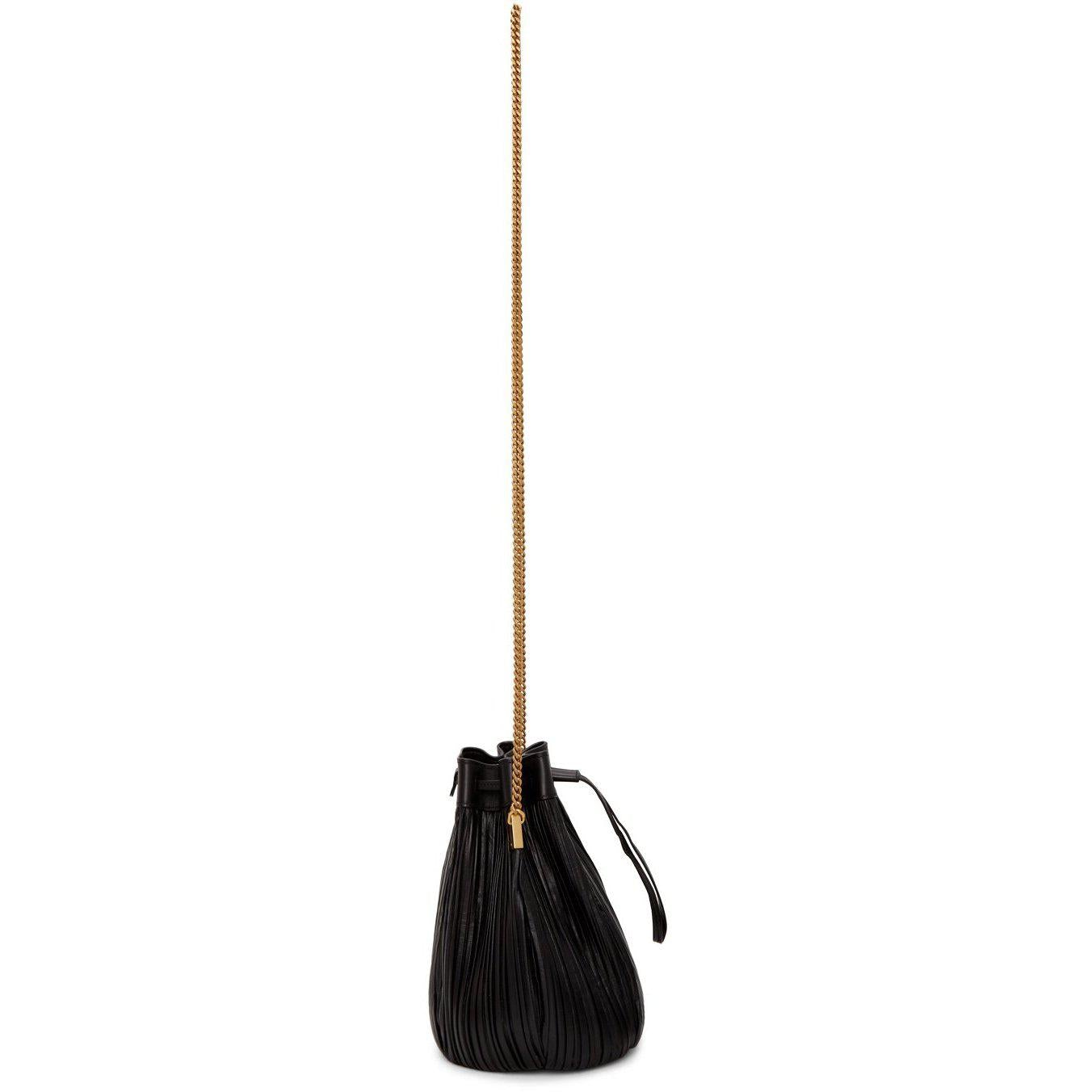 Leather shoulder bag in black featuring pleats throughout. Curb chain shoulder strap. Leather drawstring at throat. Patch pocket and logo printed in gold-tone at interior. Tonal twill lining. Gold-tone hardware. Approx. 8 length x 9 height x 6 width. Supplier color: Black Leather. Brand: Saint Laurent