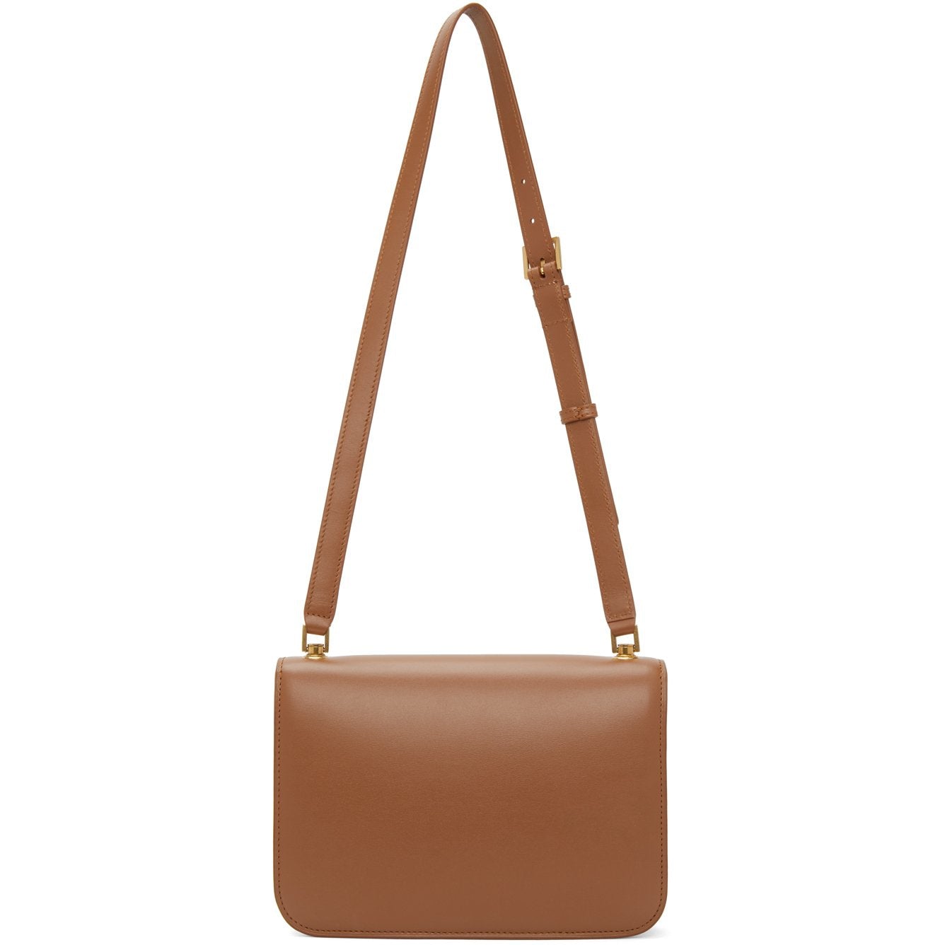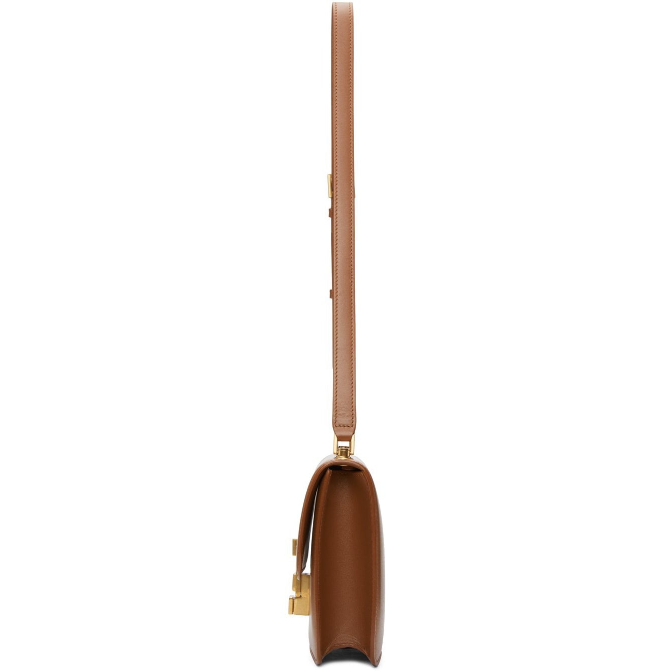 Buffed calfskin shoulder bag in brown. Adjustable shoulder strap with pin-buckle fastening. Foldover flap with press-release fastening. Patch pocket, zippered pocket, and leather logo patch at interior. Tonal leather lining. Logo-engraved antiqued gold-tone hardware. Approx. 9 length x 6.5 height x 2 width. Supplier color: Brick Calfskin. Brand: Saint Laurent