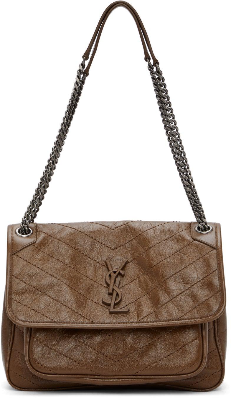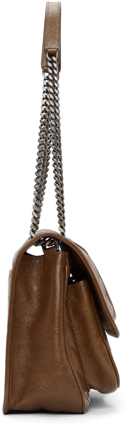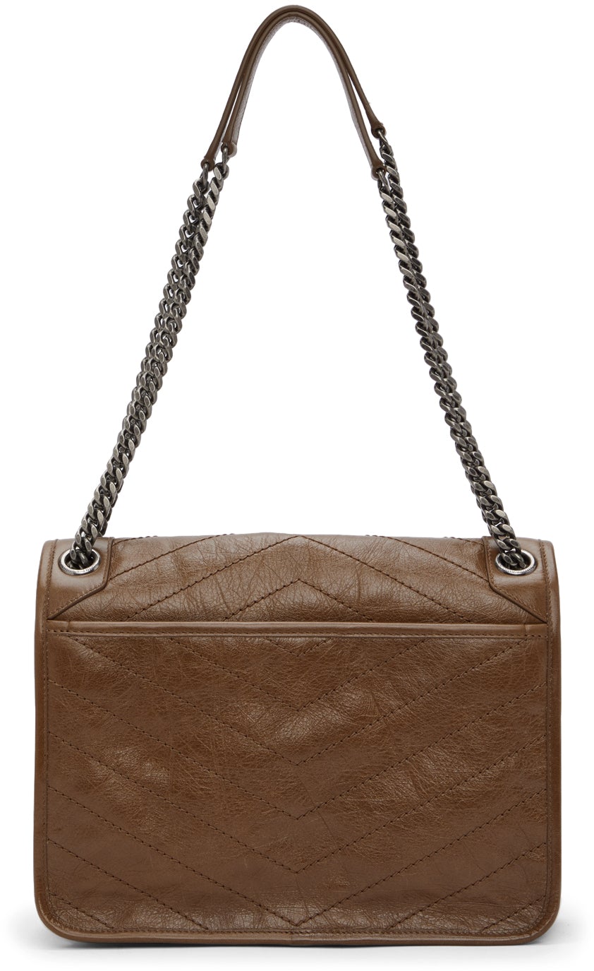 Quilted crinkled calfskin shoulder bag in brown. Sliding curb chain shoulder strap with buffed leather strap pad. Tonal logo plaque and concealed patch pocket at face. Patch pocket with magnetic fastening at back face. Foldover flap with magnetic press-stud fastening. Silver-tone logo stamp, leather logo patch, patch pocket, and zippered pocket at interior. Textile lining in black. Gunmetal-tone hardware. Approx. 11 length x 7.75 height x 3.25 width. Supplier color: Tan brown Calfskin. Brand: Saint Laurent