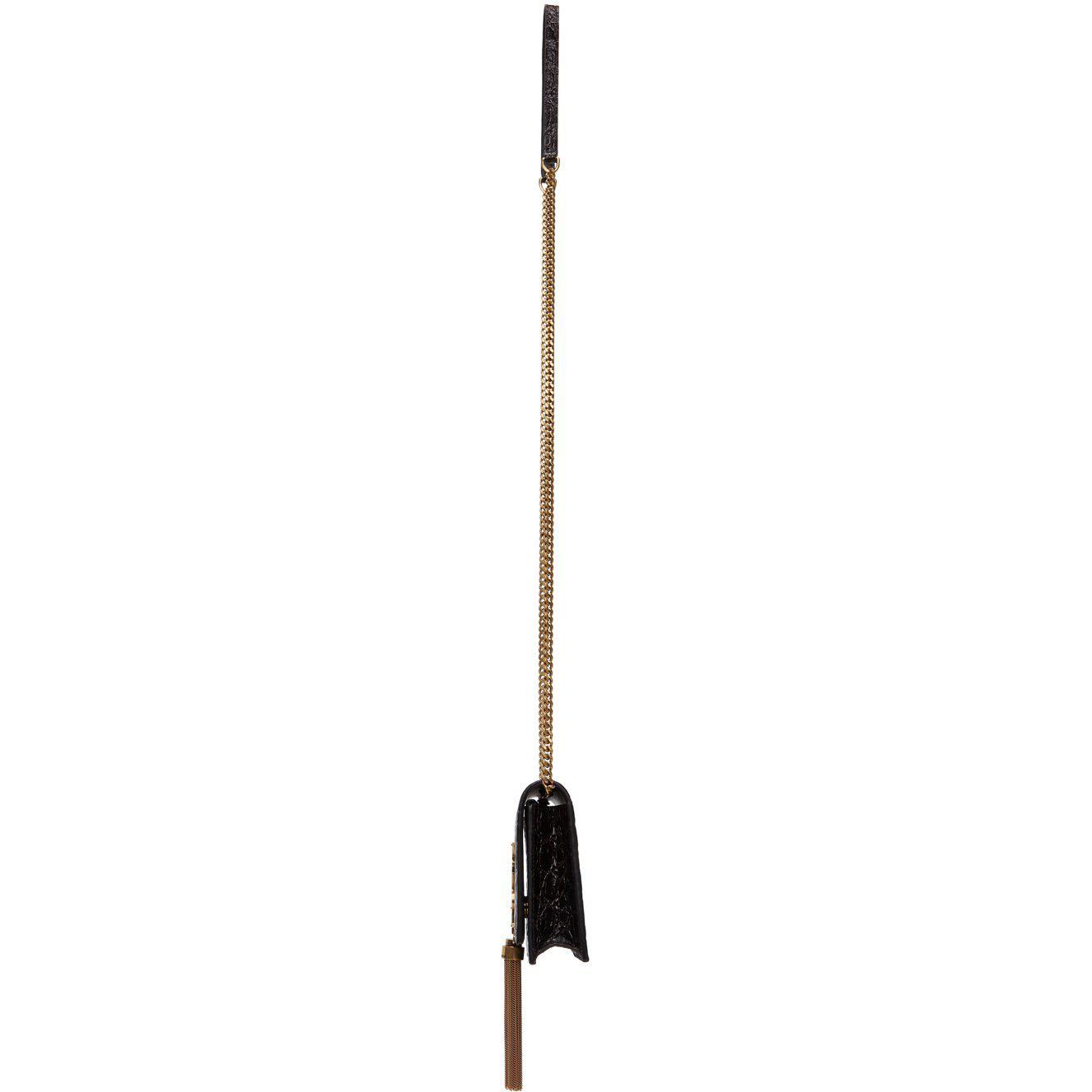 Croc-embossed calfskin shoulder bag in brown. Detachable curb chain shoulder strap with leather strap pad and lobster-clasp fastening. Logo plaque and chain tassel at face. Foldover flap with magnetic press-stud fastening. Zippered pocket, six card slots, one note slot, and gold-tone logo stamp at interior. Tonal buffed leather lining. Logo-engraved gold-tone hardware. Approx. 7.5 length x 5 height x 1.5 width. Supplier color: Fondente Calfskin. Brand: Saint Laurent