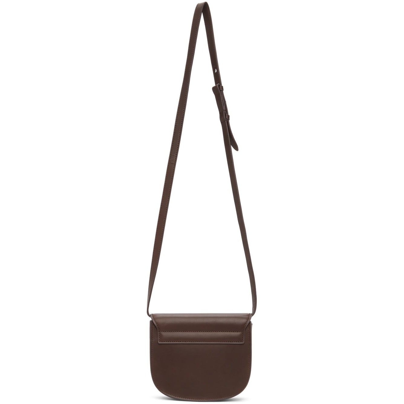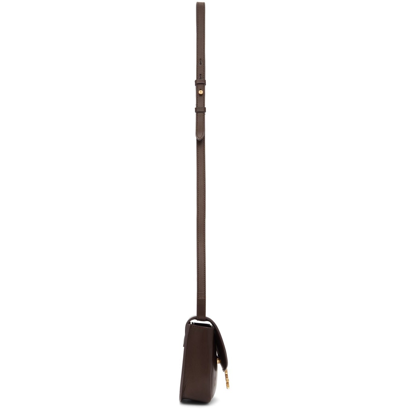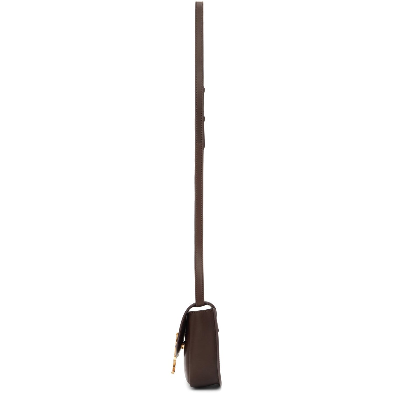 Buffed calfskin shoulder bag in brown. Detachable and adjustable shoulder strap with post-stud fastening. Logo plaque at face. Foldover flap with magnetic press-stud fastening. One card slot and embossed logo at two compartment interior. Tonal suede lining. Gold-tone hardware. Approx. 7 length x 6 height x 2.5 width. Supplier color: Dark oak Calfskin. Brand: Saint Laurent