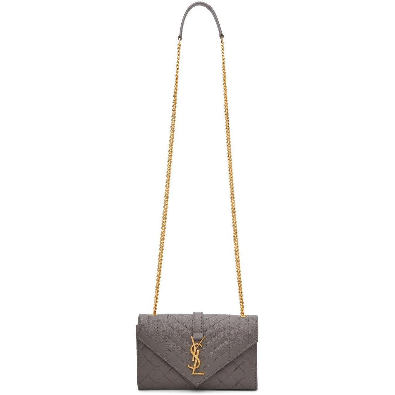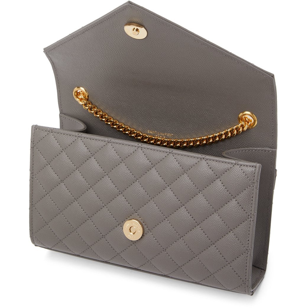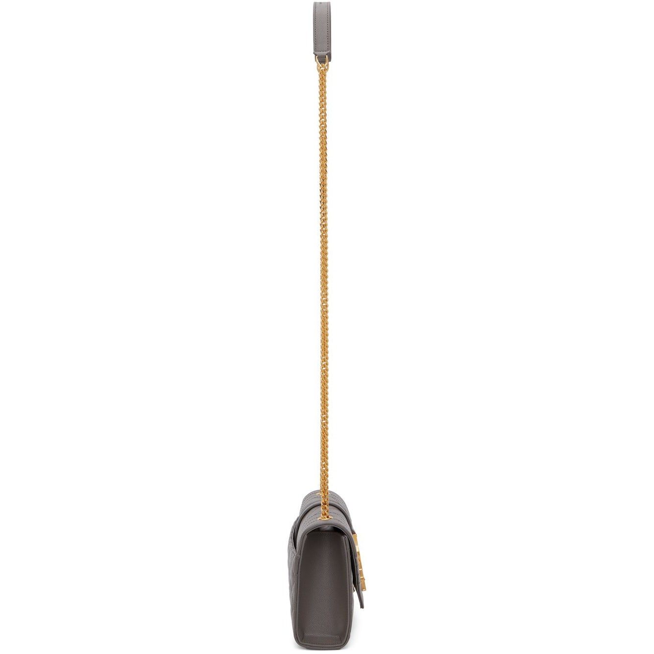 Quilted pebble grained calfskin shoulder bag in grey. Sliding curb chain shoulder strap with leather strap pad. Logo plaque at face. Patch pocket at back face. Foldover flap with magnetic press-stud fastening. Gold-tone logo stamp, leather logo patch, and patch pocket at interior. Textile lining in black. Gold-tone hardware. Approx. 8.25 length x 5 height x 2.25 width. Supplier color: Fog Calfskin. Brand: Saint Laurent