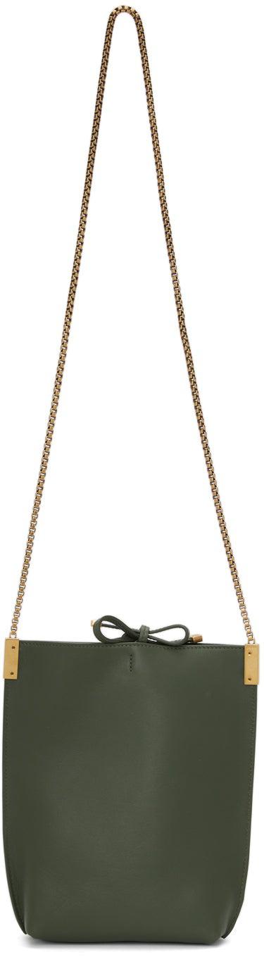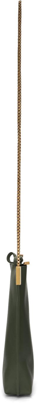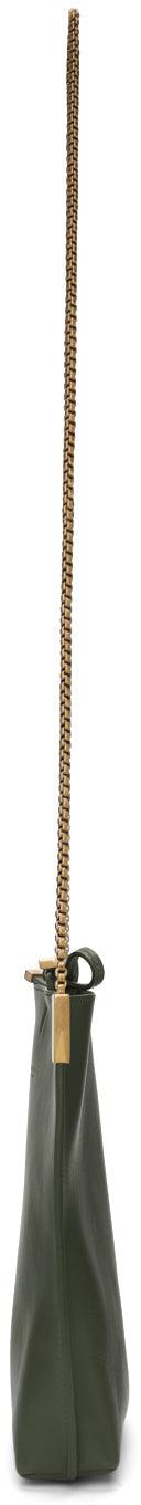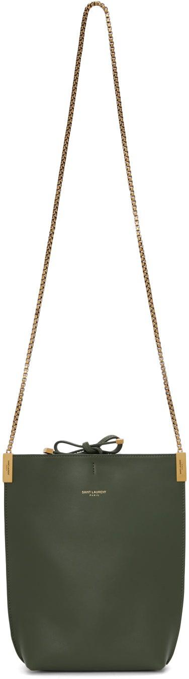 Grained calfskin shoulder bag in khaki. Box chain shoulder strap. Gold-tone logo stamp at face. Self-tie fastening at throat. Pouch featuring gold-tone logo stamp and card slot on lanyard at interior. Tonal suede lining. Logo-engraved antiqued gold-tone hardware. Approx. 7.25 length x 8.5 height x 2 width. Supplier color: Olive Calfskin. Brand: Saint Laurent