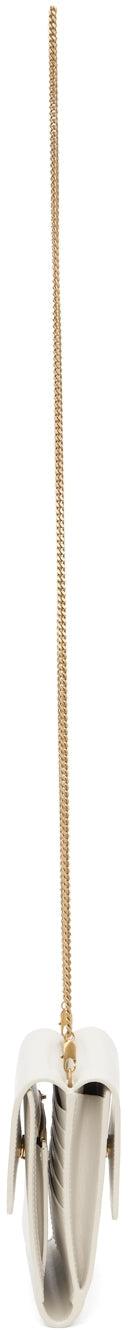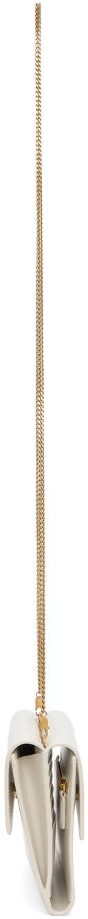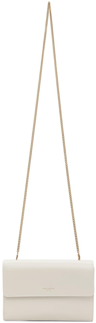 Buffed calfskin shoulder bag in off-white. Detachable curb chain shoulder strap with lobster clasp fastening. Gold-tone logo stamp and foldover flap with press-stud fastening at face and back face. Ten card slots, one note slot, and zippered pocket at interior. Embossed leather lining in black. Gold-tone hardware. Approx. 7.5 length x 5 height x 1 width. Supplier color: Vintage white Calfskin. Brand: Saint Laurent