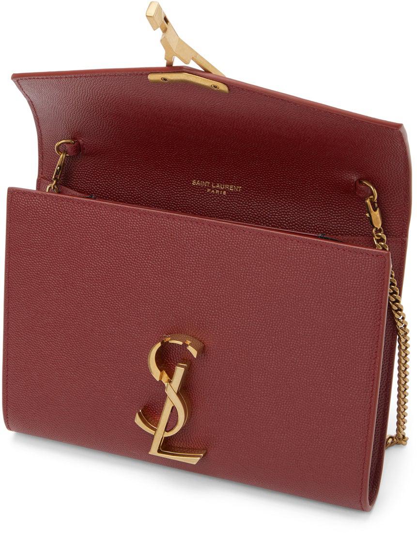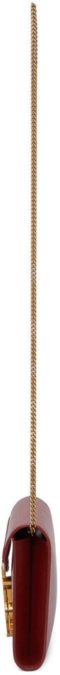 Embossed calfskin shoulder bag in red. Detachable curb chain shoulder strap with lobster clasp fastening. Logo plaque at face. Foldover flap with turn-lock fastening. Gold-tone logo stamp, three card slots, and patch pocket at interior. Tonal and black buffed leather lining. Antiqued gold-tone hardware. Approx. 7.5 length x 6 height x 1.25 width. Supplier color: Opyum red Calfskin. Brand: Saint Laurent