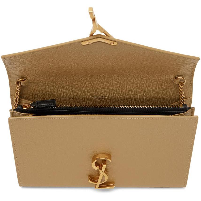 Embossed calfskin shoulder bag in taupe. Tonal burnished edges throughout. Curb chain shoulder strap. Logo hardware at face. Accordion panel detailing at sides. Foldover flap featuring turn-lock fastening. Logo stamped in gold tone, patch pocket, zippered pocket, one note slot, and ten card slots at two-compartment interior. Buffed leather lining in black. Antiqued gold-tone hardware. Approx. 8.5 length x 6 height x 1.5 width. Supplier color: Latte Calfskin. Brand: Saint Laurent