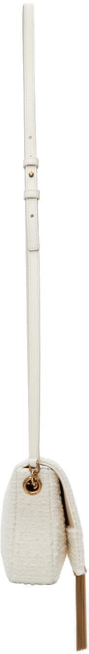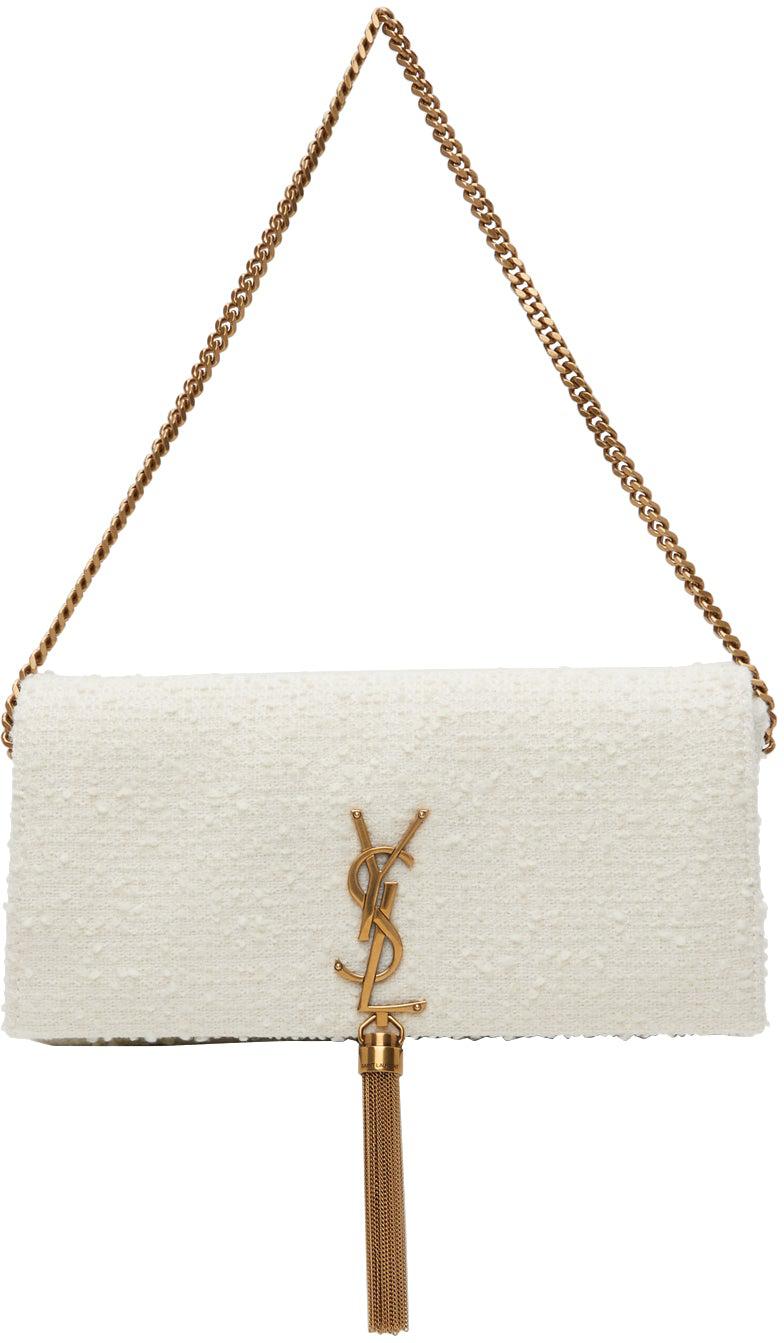 Virgin wool-blend bouclé shoulder bag in white. Detachable curb chain shoulder strap with toggle fastening. Adjustable and detachable lambskin shoulder strap with post-stud and toggle fastening for alternate styling. Logo plaque and curb chain tassel at face. Foldover flap with magnetic press-stud fastening. Logo stamp in gold-tone, leather logo patch, and zippered pocket at interior. Grosgrain lining in black. Logo-engraved gold-tone hardware. Approx. 10.5 length x 6 height x 2 width. Supplier color: Chalk white Textile. Brand: Saint Laurent