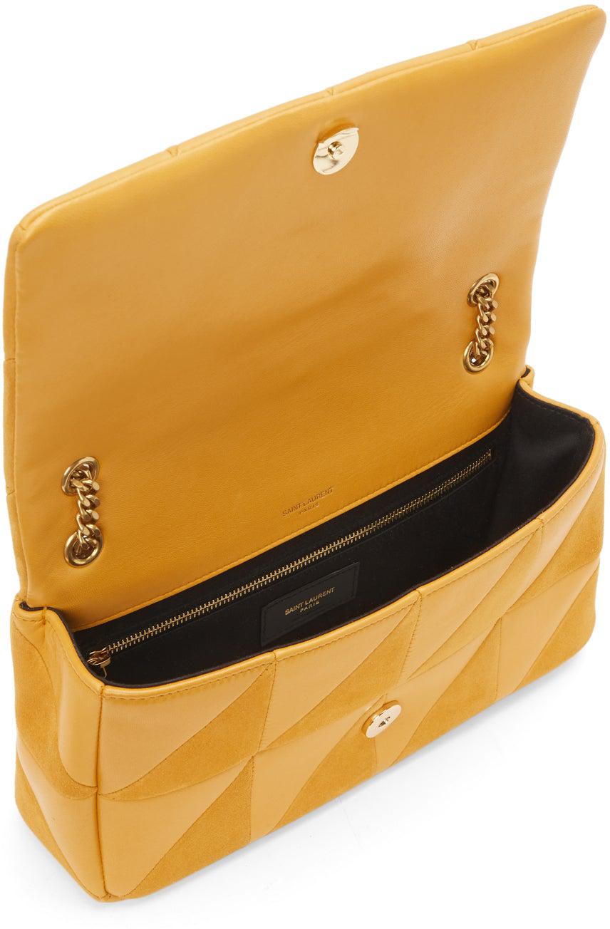 Paneled and quilted buffed lambskin and lambskin suede shoulder bag in yellow. Sliding curb chain shoulder strap featuring tonal leather strap pads. Logo hardware at face. Foldover flap with magnetic press-stud closure. Embossed logo, leather logo patch, zippered pocket, and patch pocket at interior. Textile lining in black. Gold-tone hardware. Approx. 10 length x 6 height x 3 width. Supplier color: Saffron Lambskin. Brand: Saint Laurent