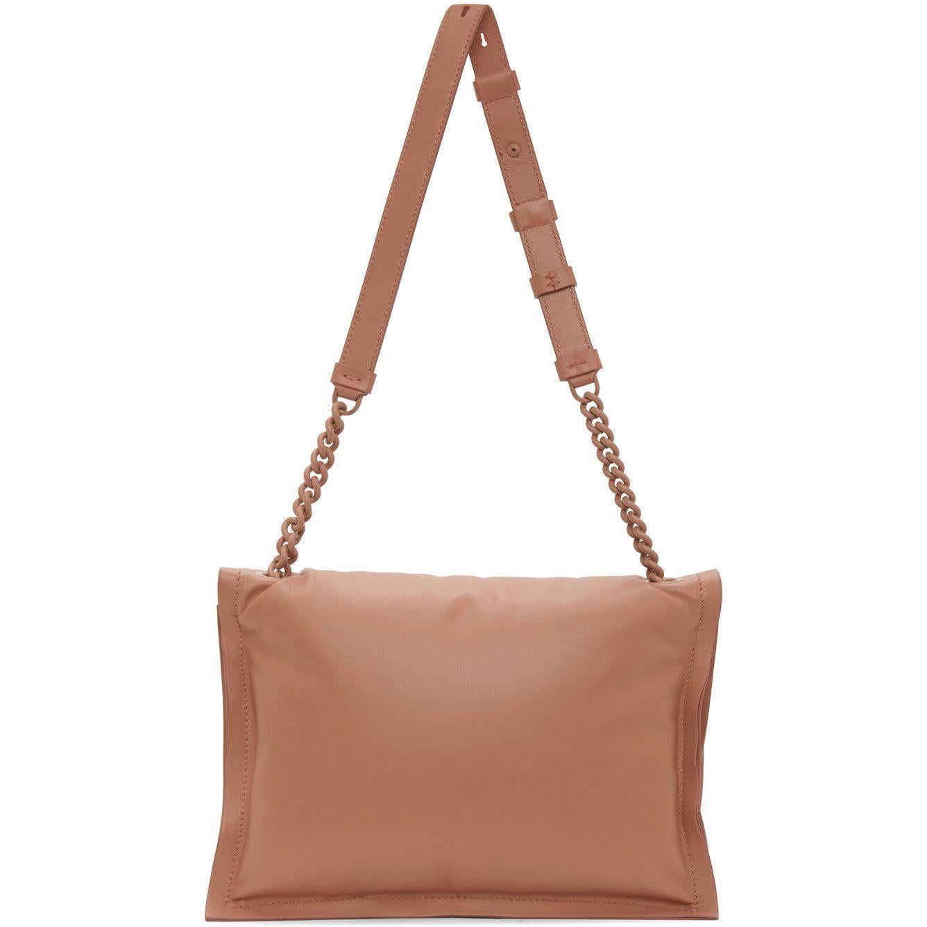 Padded buffed calfskin shoulder bag in pink. Adjustable chain link shoulder strap with tonal leather strap pad and pin-buckle fastening. Bow accent and logo hardware at face. Foldover flap with magnetic press-stud fastening. Leather logo patch, patch pocket, and two card slots at zippered two-compartment interior. Tonal buffed leather lining. Silver-tone hardware. Approx. 10.75 length x 7 height x 3 width. Supplier color: Blush pink Calfskin. Brand: Salvatore Ferragamo