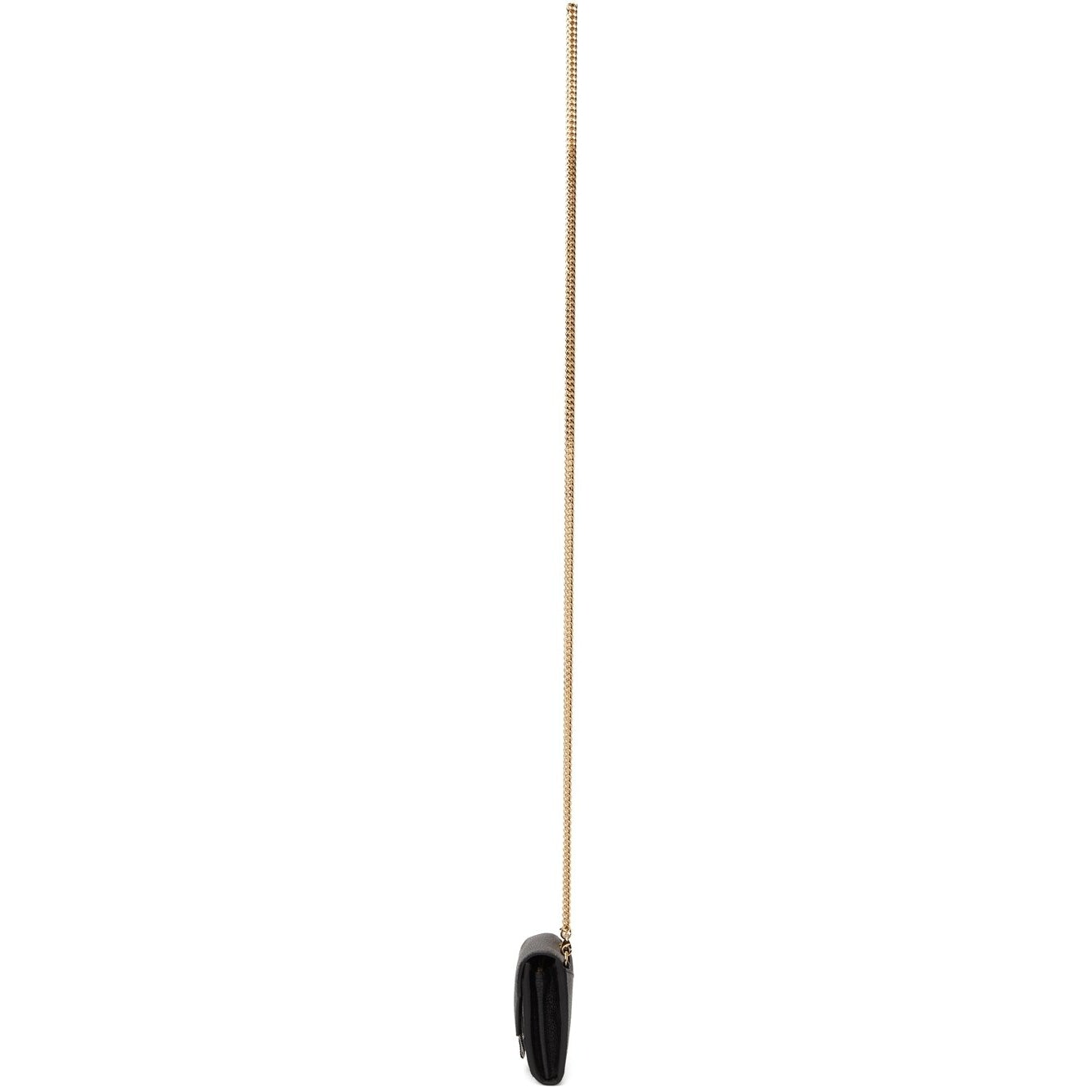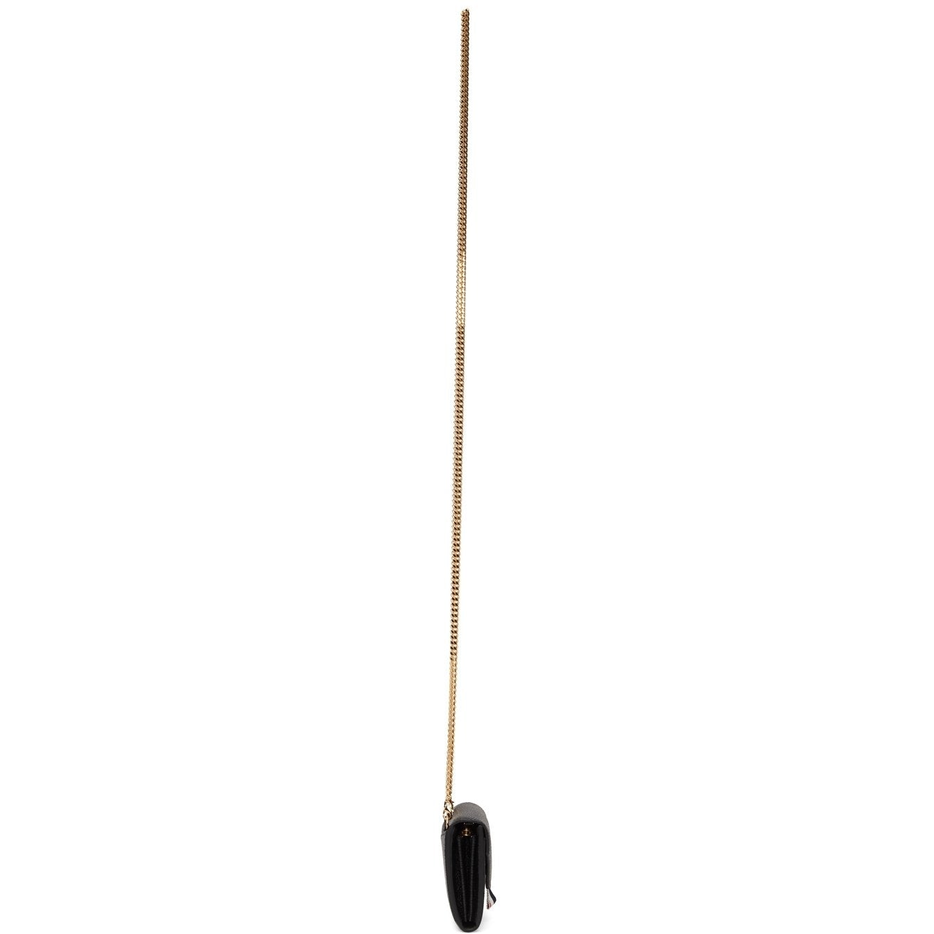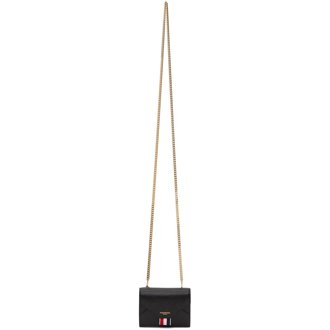 Pebble grained calfskin shoulder bag in black. Detachable curb chain shoulder strap with lobster clasp fastening. Gold-tone logo stamp, signature tricolor grosgrain flag, and concealed patch pocket at face. Patch pocket at back face. Foldover flap with press-stud fastening. Zippered pocket, five card slots, and two note slots at two-compartment interior. Tonal canvas and signature tricolor grosgrain lining. Gold-tone hardware. Approx. 4.5 length x 3.5 height x 1.25 width Supplier color: Black Calfskin. Brand: Thom Browne