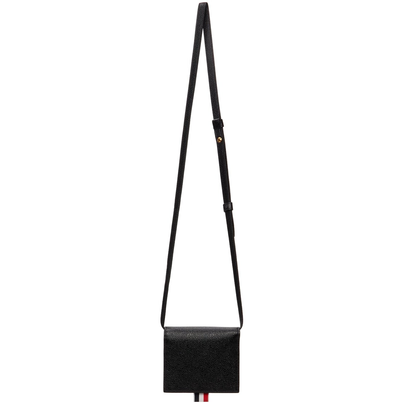 Pebble grained calfskin shoulder bag in black. Shoulder strap with post-stud fastening. Logo stamp in gold-tone and signature tricolor grosgrain flag at face. Foldover flap with press-stud fastening. Zippered pocket and three card slots at interior. Tonal textile lining. Gold-tone hardware. Approx. 4.5 length x 4 height x 1.5 width. Supplier color: Black Calfskin. Brand: Thom Browne