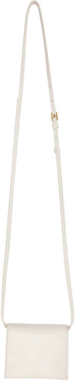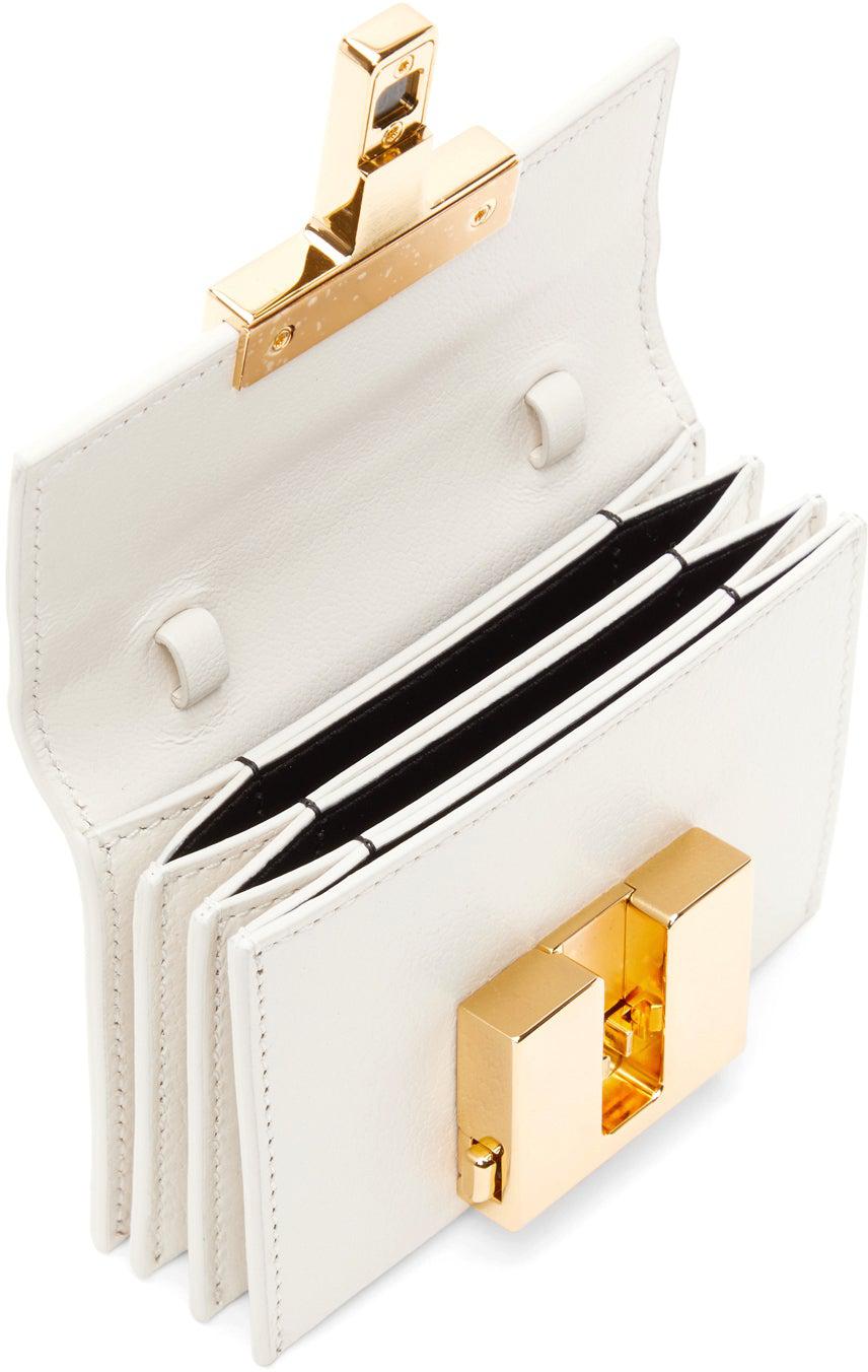 Grained goatskin shoulder bag in white. Adjustable and detachable shoulder strap with pin-buckle fastening. Expansion panel at sides and base. Foldover flap with logo hardware and press-release fastening. Gold-tone logo stamp at four-compartment interior. Leather lining in black. Logo-engraved gold-tone hardware. Approx. 4.5 length x 3.5 height x 1 width. Supplier color: Chalk Leather. Brand: TOM FORD