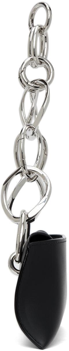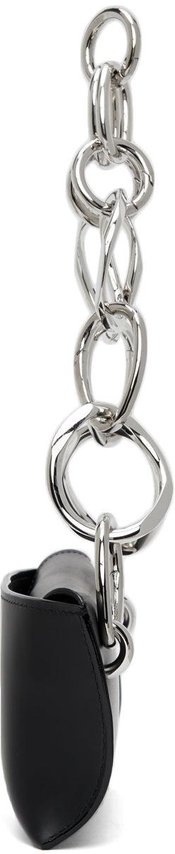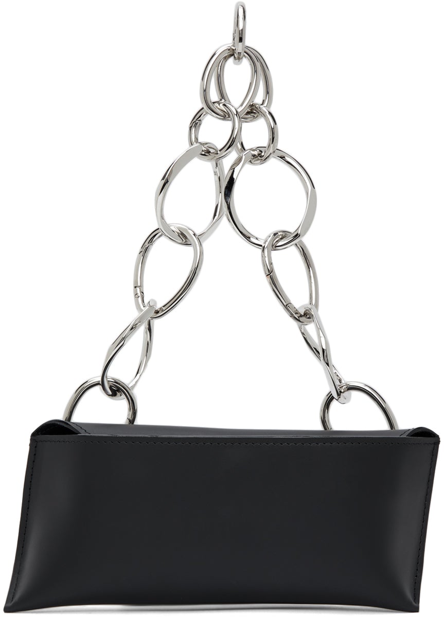Buffed leather shoulder bag in black. Asymmetric construction. Adjustable chain link shoulder strap with lanyard clasp fastening. Logo embossed at back face. Fold-in flap with magnetic press-stud fastening. Two patch pockets at interior. Tonal suede interior. Silver-tone hardware. Approx. 10 length x 5 height x 2 width. Available exclusively at SSENSE. Supplier color: Black Leather. Brand: Venczel