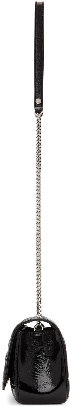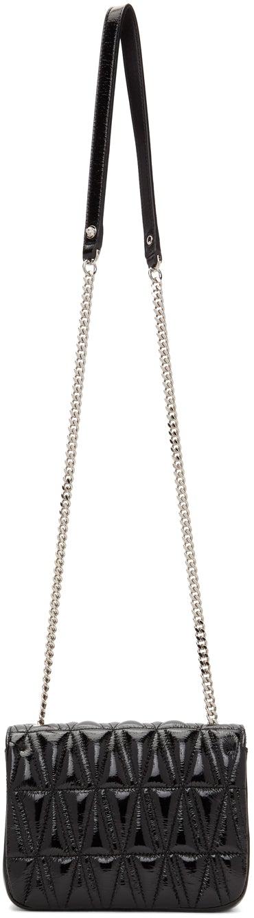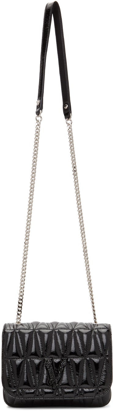 Quilted naplak patent leather shoulder bag in black. Buffed leather and curb chain shoulder strap featuring signature Medusa hardware. Tonal logo hardware at face. Foldover flap with press-stud closure at main compartment. Three card slots and logo embossed in silver-tone at interior. Tonal buffed leather lining. Silver-tone hardware. Approx. 7 length x 5.75 height x 3 width. Supplier color: Black Leather. Brand: Versace