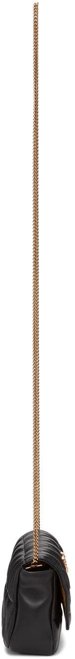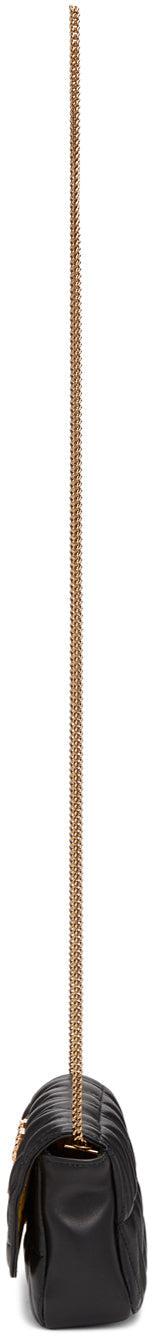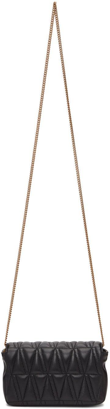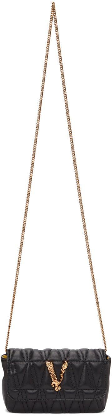 Quilted leather shoulder bag in black. Detachable curb chain shoulder strap with toggle fastening. Logo hardware at face. Foldover flap with magnetic press-stud fastening. Three card slots and gold-tone logo hardware at interior. Buffed leather lining featuring graphic in tones of yellow, brown, and black. Gold-tone hardware. Approx. 6.5 length. x 4 height x 2 width. Supplier color: Black Leather. Brand: Versace