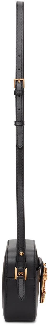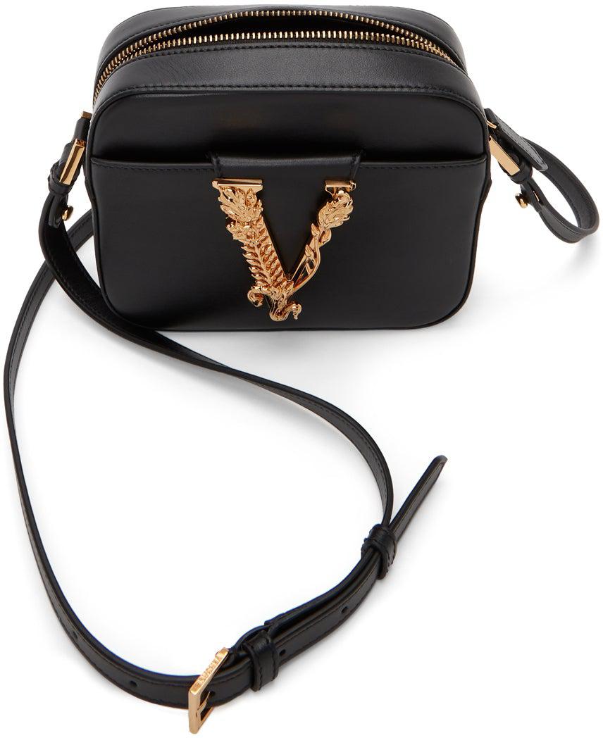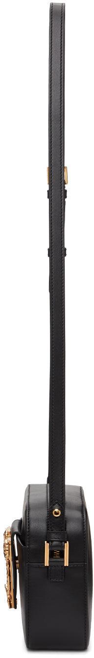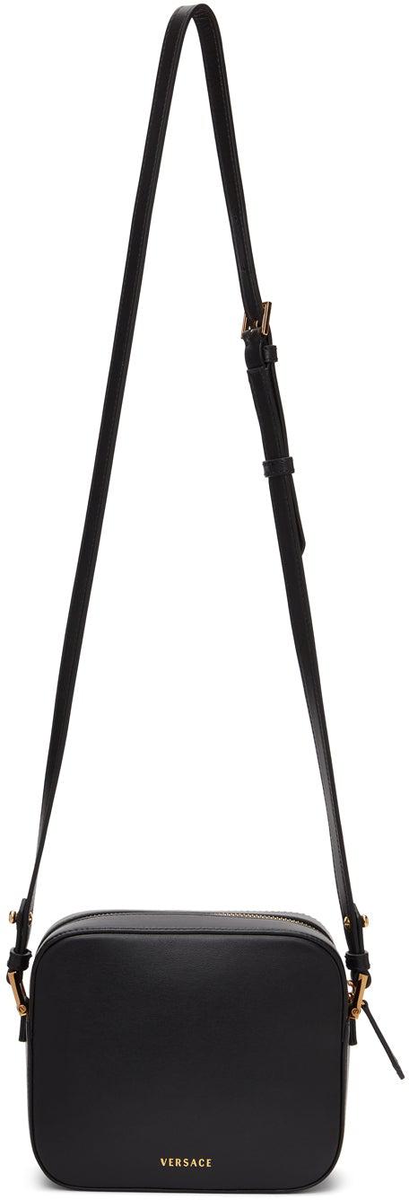 Buffed leather shoulder bag in black. Adjustable shoulder strap with pin-buckle fastening. Logo hardware at face. Partially concealed patch pocket with foldover flap and magnetic press-stud fastening at face. Gold-tone logo stamp at back face. Zip closure at main compartment. Patch pocket and gold-tone logo stamp at interior. Tonal leather lining. Gold-tone hardware. Approx. 7 length x 5.75 height x 2.5 width. Supplier color: Black Leather. Brand: Versace