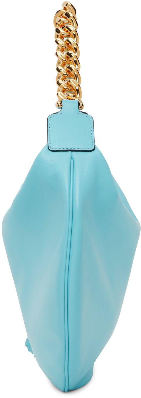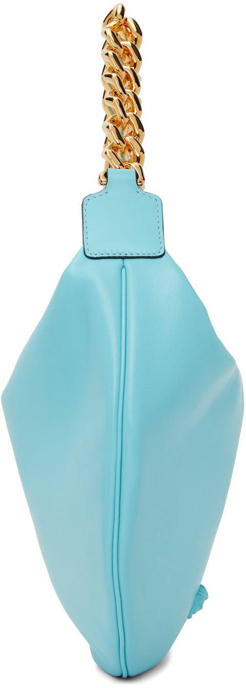 Nappa leather shoulder bag in blue. Burnished edges in black throughout. Fixed curb chain shoulder strap. Signature Medusa hardware at face. Gold-tone logo stamp at back face. Zip closure. Gold-tone logo stamp at interior. Tonal nappa leather lining. Blue and gold-tone hardware. Approx. 14 length x 11 height x 1 width. Supplier color: Blue Leather. Brand: Versace