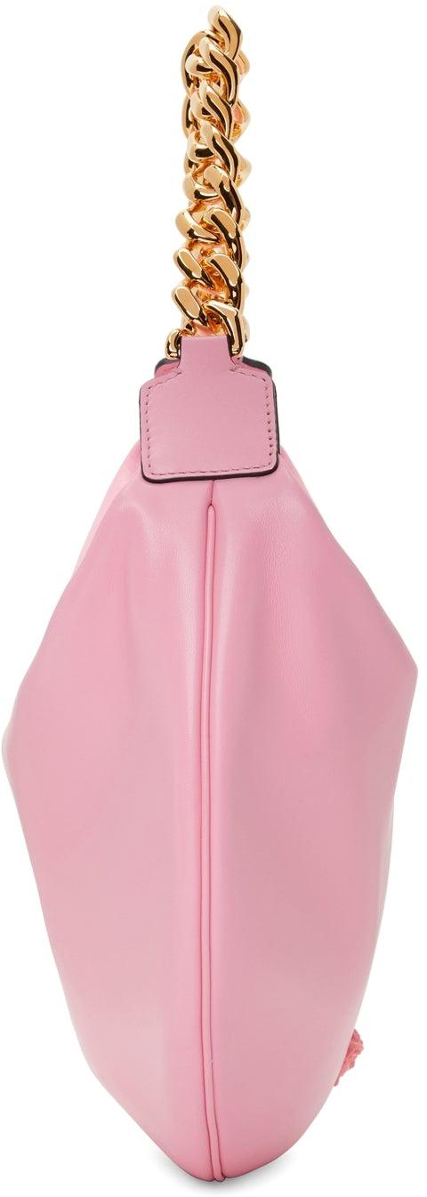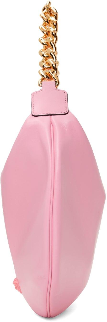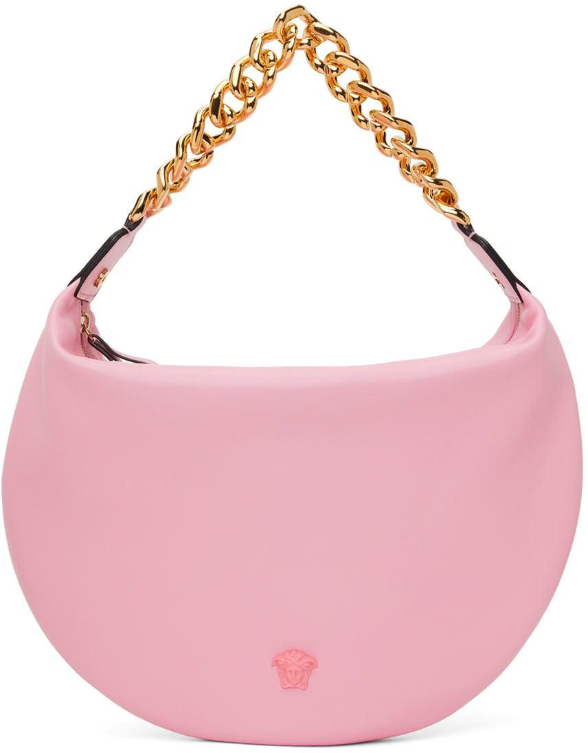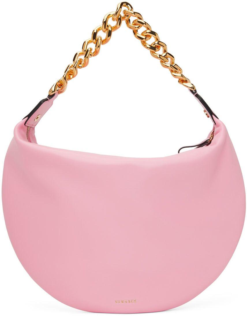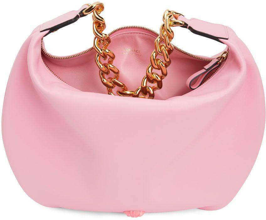 Nappa leather shoulder bag in pink. Burnished edges in black throughout. Fixed curb chain shoulder strap. Signature Medusa hardware at face. Gold-tone logo stamp at back face. Zip closure. Gold-tone logo stamp at interior. Tonal nappa leather lining. Pink and gold-tone hardware. Approx. 14 length x 11 height x 1 width. Supplier color: Pink Leather. Brand: Versace