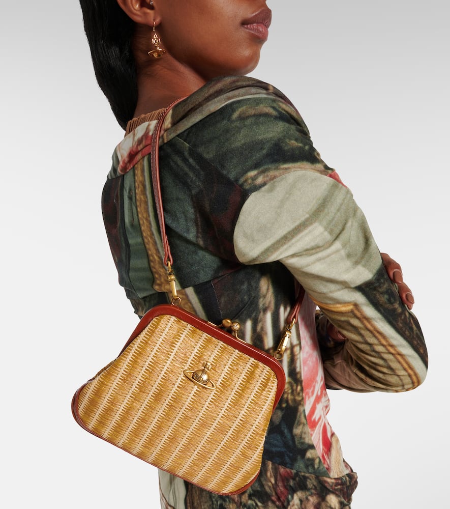 Material: raffia. Lining: fabric. Made in China. Designer color name: Tan. Trim: leather. Internal details: internal slot pocket. Closure: snap-clasp fastening. Detachable top handle. Includes: dust bag. Shop the latest Vivienne Westwood Shoulder Bags for women now.