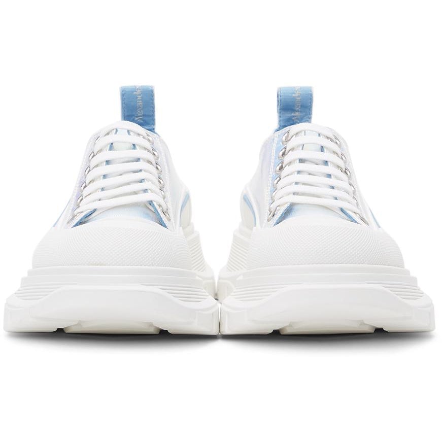 Low-top canvas sneakers in iridescent silver-tone. Round rubber cap toe in white. Lace-up closure in white. Logo printed in white at tongue. Logo-woven webbing pull-loop in blue at heel collar. Textured rubber platform midsole featuring stripe in blue and embossed logo at outer side. Treaded rubber outsole in white. Silver-tone hardware. Approx. 1.75 platform. Supplier color: Multicolor/White/Silver Upper: textile. Sole: rubber. Brand: Alexander McQueen