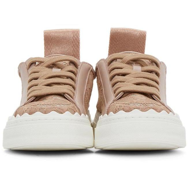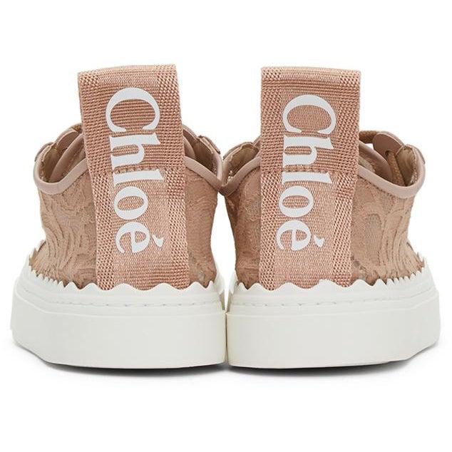 Low-top nylon lace and leather sneakers in pink. Round toe. Leather trim at tonal lace up closure. Logo woven at lace side panels. Webbing pull-loop and logo printed in white at heel. Scalloped detailing at white rubber midsole. Treaded rubber outsole in off-white. Supplier color: Pink tea Upper: textile, leather. Sole: rubber. Brand: Chloé