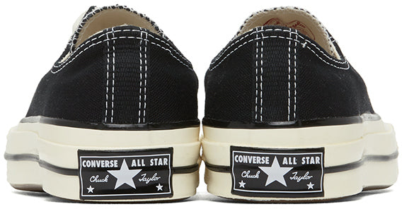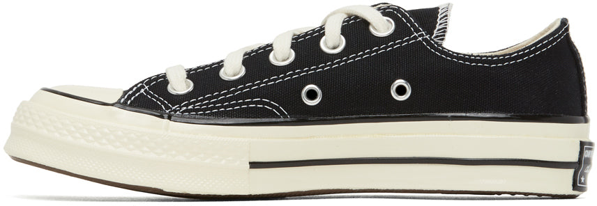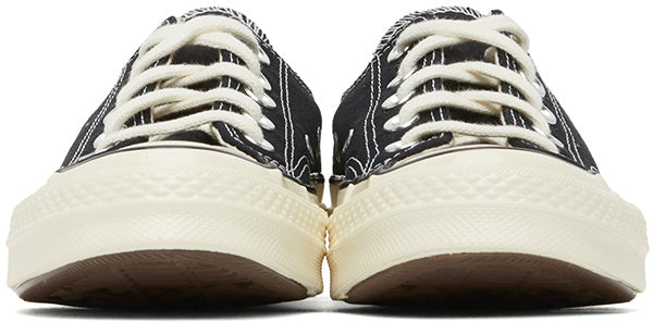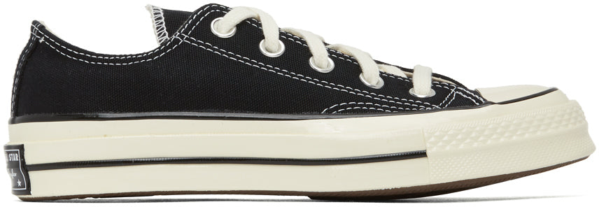 Low-top canvas sneakers in black. Round rubber cap toe in off-white. Lace-up closure in off-white. Rubberized logo patch at tongue. Eyelet vents at inner side. Tonal rubberized stripe at welt. Rubber midsole in off-white featuring black stripe and rubberized logo patch at heel. Treaded rubber outsole in brown. Silver-tone hardware. Supplier color: Black/Black/Egret Upper: textile. Sole: rubber. Brand: Converse