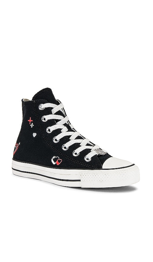 Converse Chuck Taylor All Star Sneaker in Black. - size 10 (also in 11, 7.5, 8, 8.5, 9, 9.5) Converse Chuck Taylor All Star Sneaker in Black. - size 10 (also in 11, 7.5, 8, 8.5, 9, 9.5) Canvas upper with rubber sole. Made in China. Lace-up front with silver-tone crystal embellished heart charm. Novelty Converse All Star patch at inner side panels. Rubberized hearts and sparkles throughout. Converse All Star license plate. Rubber toe cap. CNVR-WZ315. A09116C. Founded in a small town of Massachusetts in 1908, Converse is a classic American brand that has always pushed the boundaries of what a sneaker can do. After basketball player Charles H. Chuck Taylor walked into their sales office in 1921, he persuaded the company to work with him and create a line of comfortable shoes designed purely for basketball. By the 1930s, basketball players throughout America were wearing the All Star silhouette, thanks to the influence of Chuck Taylor. Since then, the iconic sneaker has maintained its appeal even after 100 years, with an influence unlike any other shoe. Shop the latest in fashion from Converse