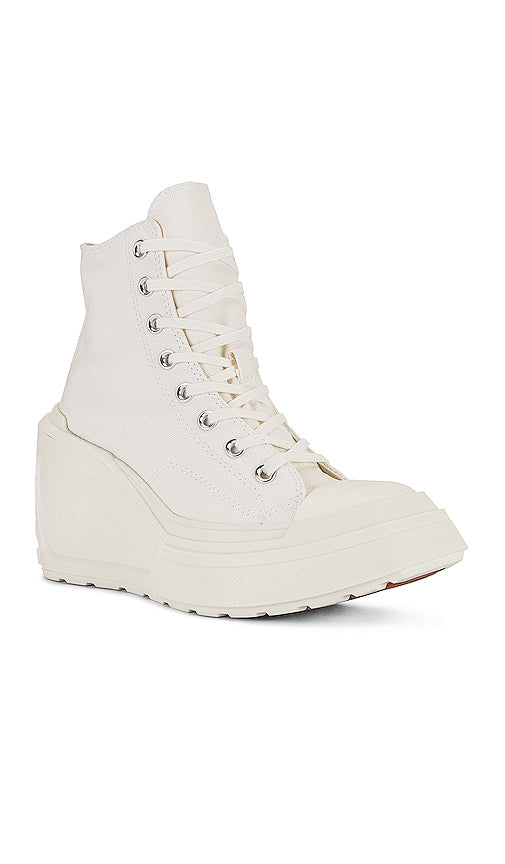 Converse De Luxe Wedge Sneaker in Ivory. - size 10 (also in 10.5, 11, 5, 8, 8.5, 9, 9.5) Converse De Luxe Wedge Sneaker in Ivory. - size 10 (also in 10.5, 11, 5, 8, 8.5, 9, 9.5) Canvas upper with rubber sole. Made in Vietnam. Lace-up front. Signature Converse All Star patch at inner side panels. Slanted square toe with rubber toe cap. Approx 90mm/ 3.5 inch wedge. CNVR-WZ306. A06479C. Founded in a small town of Massachusetts in 1908, Converse is a classic American brand that has always pushed the boundaries of what a sneaker can do. After basketball player Charles H. Chuck Taylor walked into their sales office in 1921, he persuaded the company to work with him and create a line of comfortable shoes designed purely for basketball. By the 1930s, basketball players throughout America were wearing the All Star silhouette, thanks to the influence of Chuck Taylor. Since then, the iconic sneaker has maintained its appeal even after 100 years, with an influence unlike any other shoe. Shop the latest in fashion from Converse