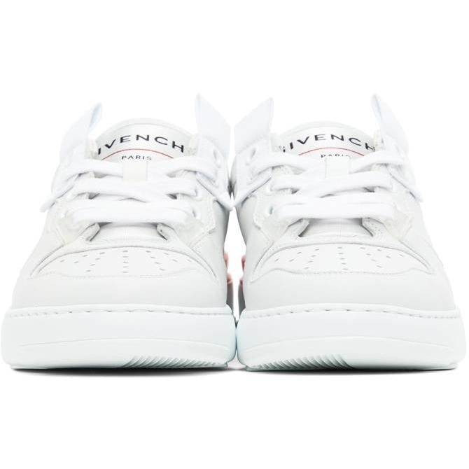 Low-top buffed calfskin sneakers in off-white. Perforated detailing at round toe. Twin webbing pull-loops at white lace-up closure. Textile logo patch at padded tongue. Padded collar. Mesh lining. Logo printed in black at outer side. Pink rubberized trim with embossed logo at heel. Tonal treaded rubber outsole. Tonal hardware. Supplier color: Natural Upper: leather. Sole: rubber. Brand: Givenchy