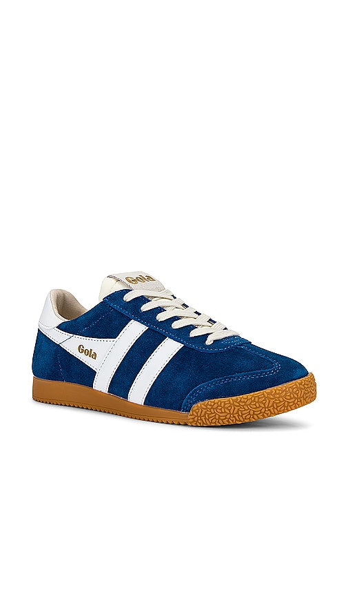 Suede and leather upper with rubber gum sole. Made in Indonesia. Lace-up front. Suede Gola logo patch at tongue. Padded low-cut collar. GLRA-WZ14. CLB538. Color: Marine Blue & White. Shop Marine Blue & White Low Top Sneakers for women and the latest Gola shoes now.