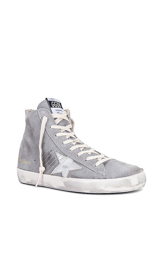 Golden Goose Francy Sneaker in Metallic Silver. - size 36 (also in 35, 37, 38, 39) Golden Goose Francy Sneaker in Metallic Silver. - size 36 (also in 35, 37, 38, 39) Suede upper with leather sole. Made in Italy. Side zipper closure with lace-up front. Laminated leather star patch at side panels. Golden Goose logo patch at tongue. Leather and French terry lining. Intentionally scuffed and distressed. GGOR-WZ586. GWF00113.F005644.70100. From Italy to the skateparks of Los Angeles, Golden Goose has become a world-renowned high fashion brand for luxury sneakers. Hand crafted on premium Italian leather; Golden Goose has successfully combined the relaxed vintage aesthetic with their unique 'lived in' touch. Their signature pre-scuffed style (each distressed by hand) offers a nonchalant attitude that embodies 'perfect imperfection' for a touch of life, comfort and fashion forward designs. Shop the latest in fashion from Golden Goose