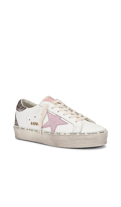 Golden Goose Hi Star Sneaker in White. - size 35 (also in 36, 37, 38, 39, 40) Golden Goose Hi Star Sneaker in White. - size 35 (also in 36, 37, 38, 39, 40) Leather upper with rubber sole. Made in Italy. Lace-up front. Nubuck leather star at side panels. Gold-tone Golden Goose logo at side panel Leather and French terry lining. Glitter embellished back counter and heel. Intentionally scuffed and distressed throughout. Approx 32mm/ 1.25 inch platform. GGOR-WZ569. GWF00119.F005335.11696. From Italy to the skateparks of Los Angeles, Golden Goose has become a world-renowned high fashion brand for luxury sneakers. Hand crafted on premium Italian leather; Golden Goose has successfully combined the relaxed vintage aesthetic with their unique 'lived in' touch. Their signature pre-scuffed style (each distressed by hand) offers a nonchalant attitude that embodies 'perfect imperfection' for a touch of life, comfort and fashion forward designs. Shop the latest in fashion from Golden Goose