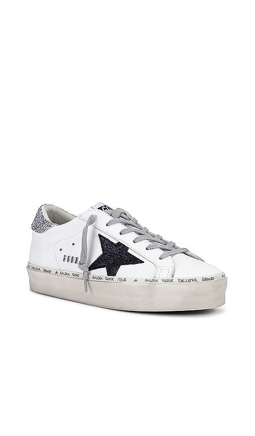 Golden Goose Hi Star Sneaker in White. - size 35 (also in 36, 37, 38, 39, 40) Golden Goose Hi Star Sneaker in White. - size 35 (also in 36, 37, 38, 39, 40) Leather upper with rubber sole. Made in Italy. Lace-up front. Pebbled leather star patch at side panels. Golden Goose logo patch at tongue. Leather and French terry lining. Intentionally scuffed and distressed with glitter embellished back counter. Approx 32mm/ 1.25 inch platform. GGOR-WZ582. GWF00118.F005336.10238. From Italy to the skateparks of Los Angeles, Golden Goose has become a world-renowned high fashion brand for luxury sneakers. Hand crafted on premium Italian leather; Golden Goose has successfully combined the relaxed vintage aesthetic with their unique 'lived in' touch. Their signature pre-scuffed style (each distressed by hand) offers a nonchalant attitude that embodies 'perfect imperfection' for a touch of life, comfort and fashion forward designs. Shop the latest in fashion from Golden Goose
