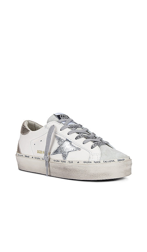 Golden Goose Hi Star Sneaker in White. - size 35 (also in 36, 37, 38, 39) Golden Goose Hi Star Sneaker in White. - size 35 (also in 36, 37, 38, 39) Leather upper with rubber sole. Made in Italy. Lace-up front. Metallic leather star patch at side panels. Golden Goose logo patch at tongue. Leather and French terry lining. Intentionally scuffed and distressed. Approx 32mm/ 1.25 inch platform. GGOR-WZ583. GWF00119.F005332.10740. From Italy to the skateparks of Los Angeles, Golden Goose has become a world-renowned high fashion brand for luxury sneakers. Hand crafted on premium Italian leather; Golden Goose has successfully combined the relaxed vintage aesthetic with their unique 'lived in' touch. Their signature pre-scuffed style (each distressed by hand) offers a nonchalant attitude that embodies 'perfect imperfection' for a touch of life, comfort and fashion forward designs. Shop the latest in fashion from Golden Goose
