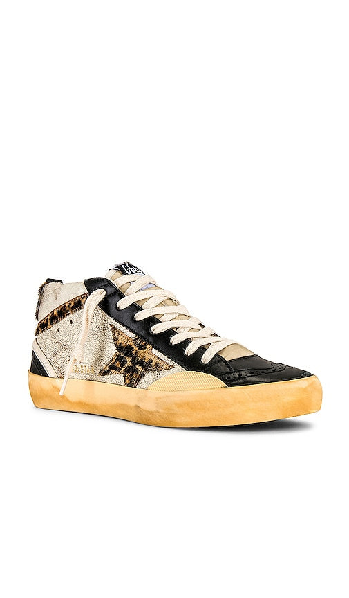 Golden Goose Mid Star Sneaker in Cream,Black. - size 37 (also in 38, 39, 40) Golden Goose Mid Star Sneaker in Cream,Black. - size 37 (also in 38, 39, 40) Leather and dyed calf hair upper with rubber sole. Made in Italy Fur Origin: Turkey. Lace-up front. Leather and French terry lining. Dyed calf hair star patch at sides. Leather heel pull. Dyed calf hair logo at back counter. Intentionally scuffed and distressed detailing. GGOR-WZ511. GWF00122.F004180.82175. From Italy to the skateparks of Los Angeles, Golden Goose has become a world-renowned high fashion brand for luxury sneakers. Hand crafted on premium Italian leather; Golden Goose has successfully combined the relaxed vintage aesthetic with their unique 'lived in' touch. Their signature pre-scuffed style (each distressed by hand) offers a nonchalant attitude that embodies 'perfect imperfection' for a touch of life, comfort and fashion forward designs. Shop the latest in fashion from Golden Goose