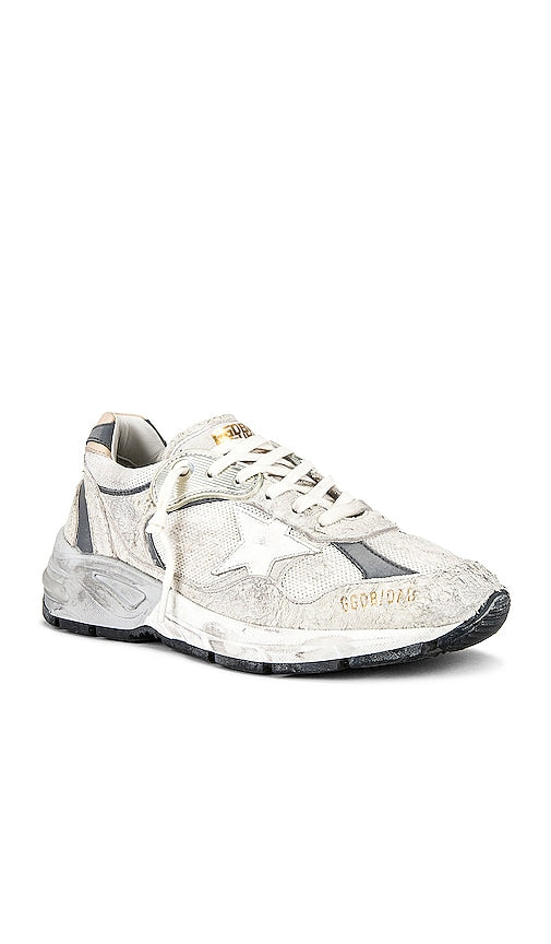 Golden Goose Running Dad Sneaker in Light Grey. - size 35 (also in 36, 37, 40) Golden Goose Running Dad Sneaker in Light Grey. - size 35 (also in 36, 37, 40) Textured suede and mesh upper with rubber sole. Made in Italy. Lace-up front. Leather and French terry lining. Vinyl tongue overlay with logo detail. White leather star at side. Intentionally scuffed and distressed. GGOR-WZ389. GWF00199.F002156.80185. From Italy to the skateparks of Los Angeles, Golden Goose has become a world-renowned high fashion brand for luxury sneakers. Hand crafted on premium Italian leather; Golden Goose has successfully combined the relaxed vintage aesthetic with their unique 'lived in' touch. Their signature pre-scuffed style (each distressed by hand) offers a nonchalant attitude that embodies 'perfect imperfection' for a touch of life, comfort and fashion forward designs. Shop the latest in fashion from Golden Goose