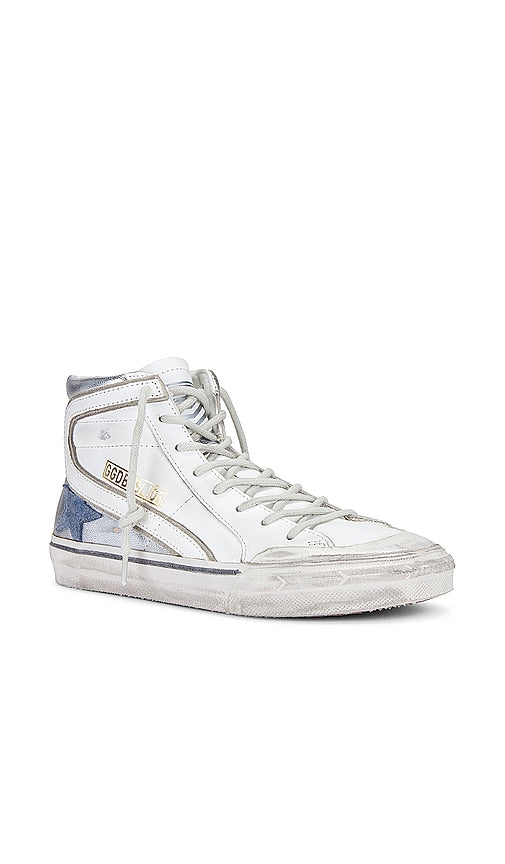 Leather upper with suede trim and rubber sole. Made in Italy. Lace-up front with side zipper closure. Suede star at outer panel with gold-tone Golden Goose logo. Leather and French terry lining. Intentionally scuffed and distressed. GGOR-WZ602. GWF00286.F005416.10403. From Italy to the skateparks of Los Angeles, Golden Goose has become a world-renowned high fashion brand for luxury sneakers. Hand crafted on premium Italian leather; Golden Goose has successfully combined the relaxed vintage aesthetic with their unique 'lived in' touch. Their signature pre-scuffed style (each distressed by hand) offers a nonchalant attitude that embodies 'perfect imperfection' for a touch of life, comfort and fashion forward designs. Color: White Silver Light Blue & Ice. Shop White Silver Light Blue & Ice Lifestyle Sneakers for women and the latest Golden Goose shoes now.