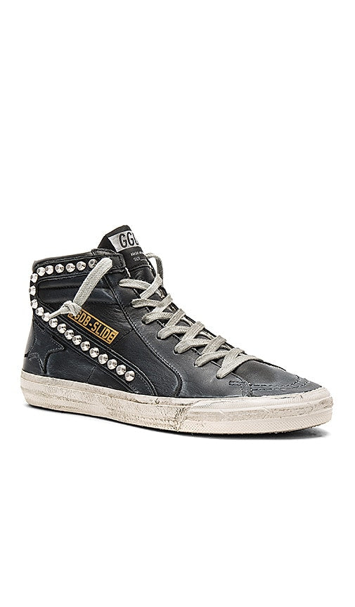 Leather upper with rubber sole. Side zip closure. Lace-up front. Raised stud accents. Intentionally distressed throughout. GGOR-WZ27. GWF00115.F000323.90100. From Italy to the skateparks of Los Angeles, Golden Goose has become a world-renowned high fashion brand for luxury sneakers. Hand crafted on premium Italian leather; Golden Goose has successfully combined the relaxed vintage aesthetic with their unique 'lived in' touch. Their signature pre-scuffed style (each distressed by hand) offers a nonchalant attitude that embodies 'perfect imperfection' for a touch of life, comfort and fashion forward designs. Color: Black Leather Studs. Shop Black Leather Studs High Top Sneakers for women and the latest Golden Goose shoes now.