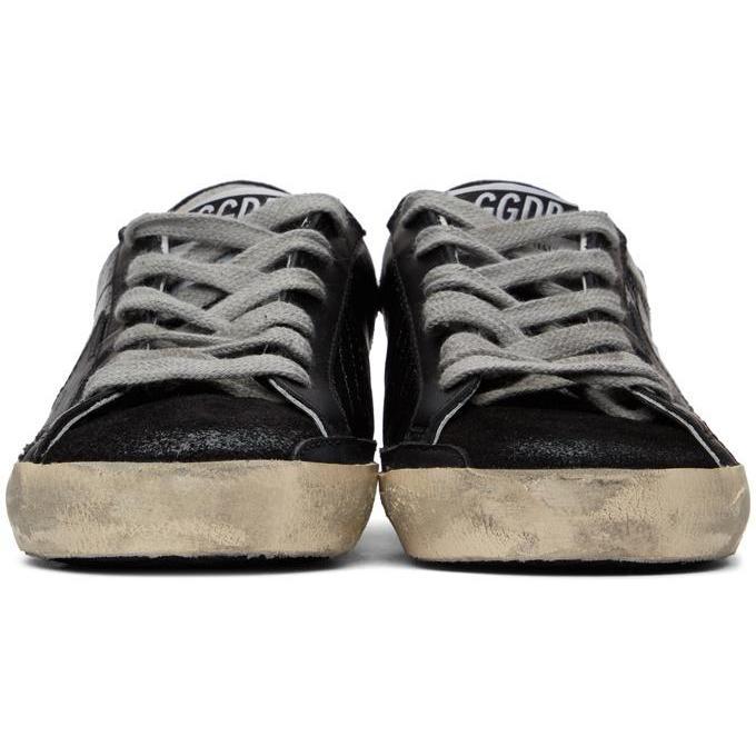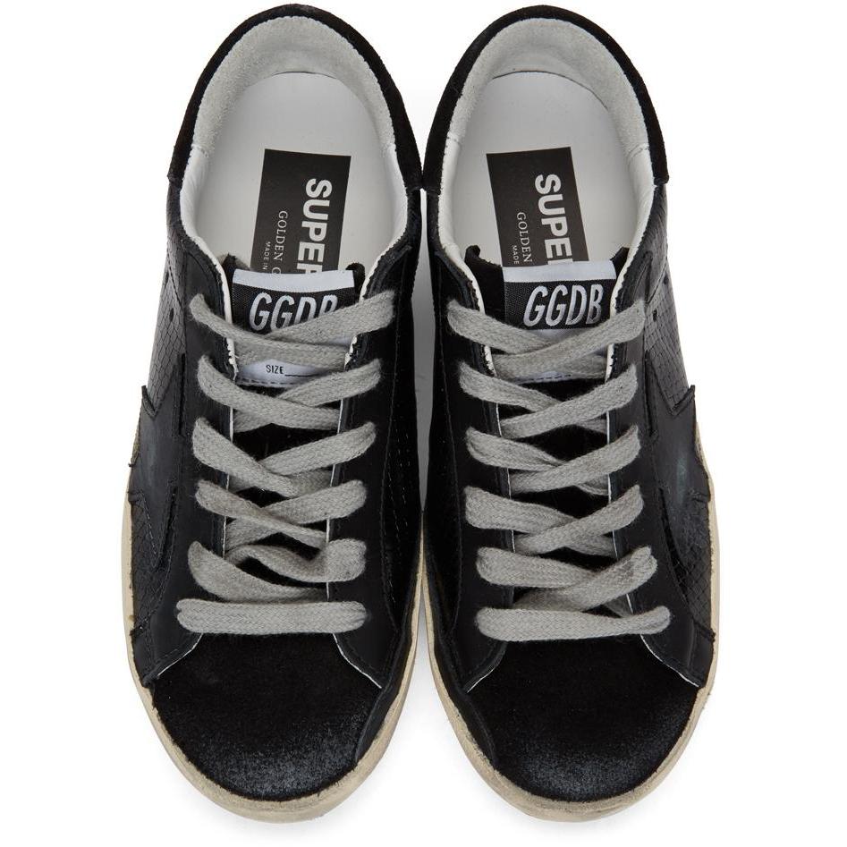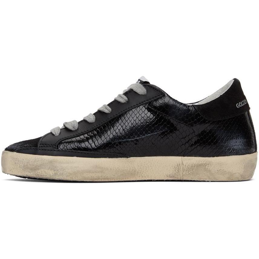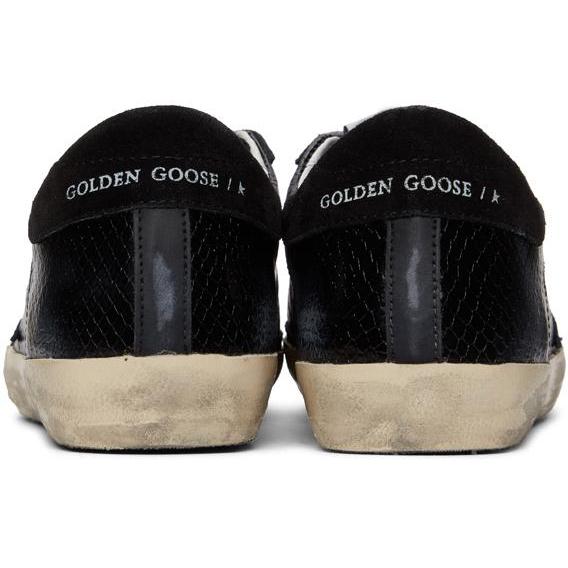 Handcrafted low-top snake-embossed and suede leather sneakers in black. Smudging and distressing throughout. Round toe. Lace-up closure in grey. Textile logo patch in white at padded tongue. Padded collar. Terrycloth and leather lining. White logo stamp at heel tab. Perforated detailing at sides. Signature tonal buffed leather appliqué at outer sides. Gold-tone logo stamp at outer side. Rubber midsole in off-white. Tonal treaded rubber outsole. Available exclusively at SSENSE. Supplier color: Black Upper: leather, textile. Sole: rubber. Brand: Golden Goose
