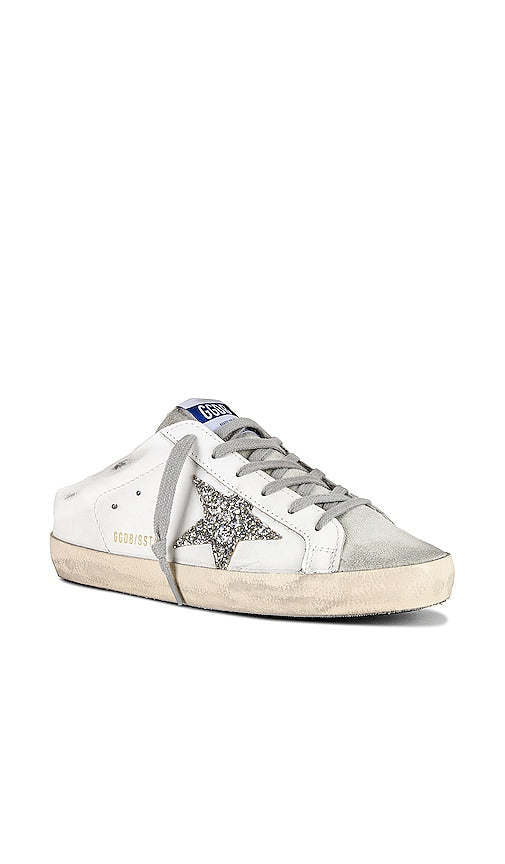 Golden Goose Super-Star Sabot Sneaker in Cream. - size 35 (also in 36, 38) Golden Goose Super-Star Sabot Sneaker in Cream. - size 35 (also in 36, 38) Leather and suede upper with rubber sole. Made in Italy. Slip-on styling with lace-up front. French terry lining and leather insole. Glitter embellished star patches at sides. Logo patch at tongue. Intentionally scuffed and distressed throughout. GGOR-WZ532. GWF00110.F001722.81194. From Italy to the skateparks of Los Angeles, Golden Goose has become a world-renowned high fashion brand for luxury sneakers. Hand crafted on premium Italian leather; Golden Goose has successfully combined the relaxed vintage aesthetic with their unique 'lived in' touch. Their signature pre-scuffed style (each distressed by hand) offers a nonchalant attitude that embodies 'perfect imperfection' for a touch of life, comfort and fashion forward designs. Shop the latest in fashion from Golden Goose