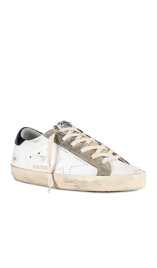 Leather and suede upper with rubber sole. Made in Italy. Lace-up front. French terry lining and leather insole. Padded foam tongue with logo patch. Perforated star outline at sides. Golden Goose logo at back counter. Intentionally scuffed and distressed throughout. GGOR-WZ531. GWF00360.F003184.81753. From Italy to the skateparks of Los Angeles, Golden Goose has become a world-renowned high fashion brand for luxury sneakers. Hand crafted on premium Italian leather; Golden Goose has successfully combined the relaxed vintage aesthetic with their unique 'lived in' touch. Their signature pre-scuffed style (each distressed by hand) offers a nonchalant attitude that embodies 'perfect imperfection' for a touch of life, comfort and fashion forward designs. Color: White Yellow Taupe & Night Blue. Shop White Yellow Taupe & Night Blue Low Top Sneakers for women and the latest Golden Goose shoes now.