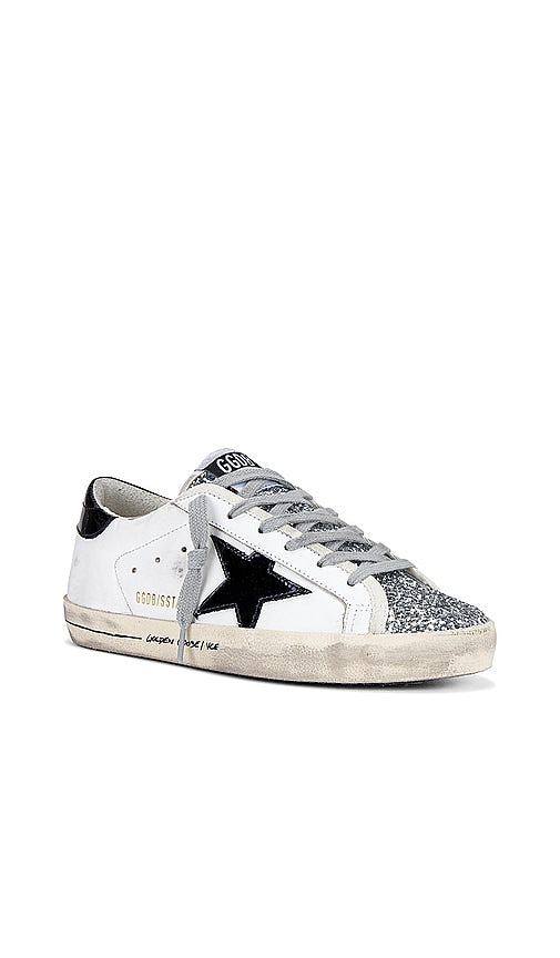 Golden Goose Super Star Sneaker in White. - size 35 (also in 37, 40) Golden Goose Super Star Sneaker in White. - size 35 (also in 37, 40) Leather and glitter upper with rubber sole. Made in Italy. Lace-up front. Patent leather star at outer panels. Glitter embellished tongue and toe. Leather and French terry lining. Intentionally scuffed and distressed. GGOR-WZ603. GWF00101.F005345.10238. From Italy to the skateparks of Los Angeles, Golden Goose has become a world-renowned high fashion brand for luxury sneakers. Hand crafted on premium Italian leather; Golden Goose has successfully combined the relaxed vintage aesthetic with their unique 'lived in' touch. Their signature pre-scuffed style (each distressed by hand) offers a nonchalant attitude that embodies 'perfect imperfection' for a touch of life, comfort and fashion forward designs. Shop the latest in fashion from Golden Goose