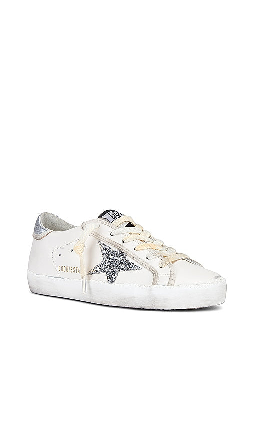 Golden Goose Super Star Sneaker in White. - size 35 (also in 36, 37, 38, 39, 40) Golden Goose Super Star Sneaker in White. - size 35 (also in 36, 37, 38, 39, 40) Leather and glitter upper with rubber sole. Made in Italy. Lace-up front. Glitter embellished star patch at outer panel with gold-tone Golden Goose Super Star Sneaker logo. Golden Goose logo patch at tongue. Leather and French terry lining. Intentionally scuffed and distressed. GGOR-WZ605. GWF00101.F004656.80185. From Italy to the skateparks of Los Angeles, Golden Goose has become a world-renowned high fashion brand for luxury sneakers. Hand crafted on premium Italian leather; Golden Goose has successfully combined the relaxed vintage aesthetic with their unique 'lived in' touch. Their signature pre-scuffed style (each distressed by hand) offers a nonchalant attitude that embodies 'perfect imperfection' for a touch of life, comfort and fashion forward designs. Shop the latest in fashion from Golden Goose